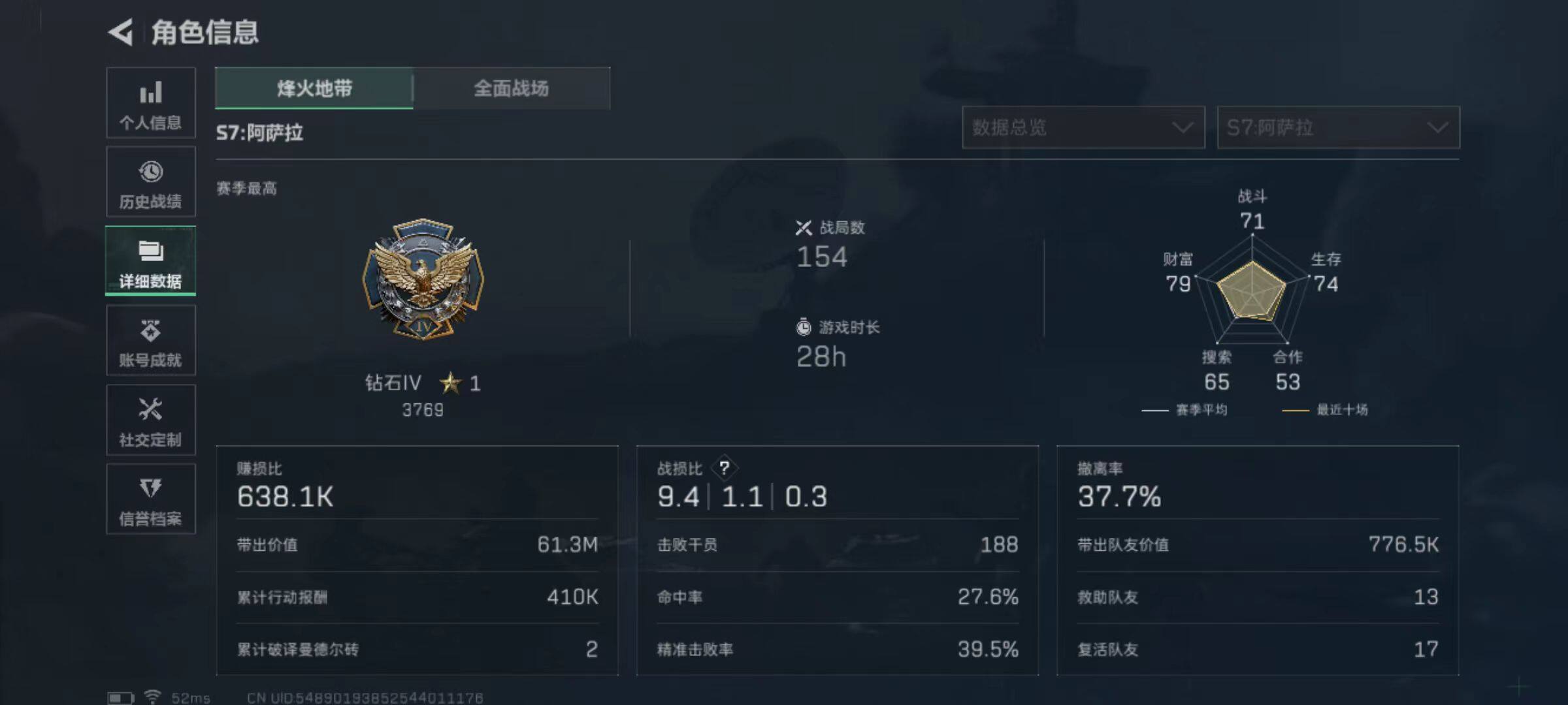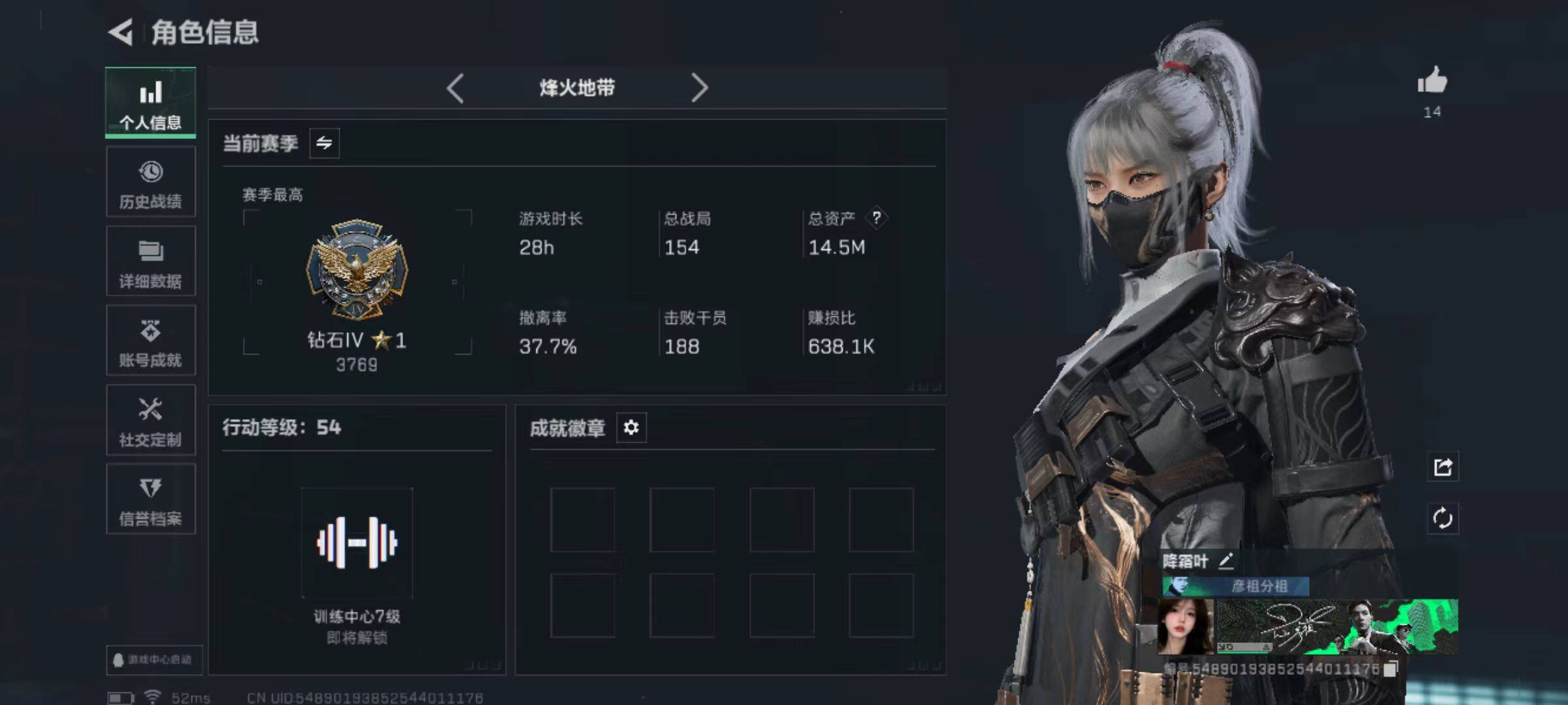 总资产(M):14M/哈夫币(K):178K/哈夫币(K):178K/全面战场等级:8_段位:列兵/烽火地带等级:54_段位:钻石/骇爪-水墨云图/无名-夜鹰/近战-黑鹰/AK-12突击步枪-夜鹰/SCAR-H战斗步枪-水墨云图/SMG-45冲锋枪-骑士/AKM突击步枪-林中猎手/QBZ95-1突击步枪-曙光/ASh-12战斗步枪-守夜人/AUG突击步枪-蝮蛇/SG552突击步枪-尖端治疗/SG