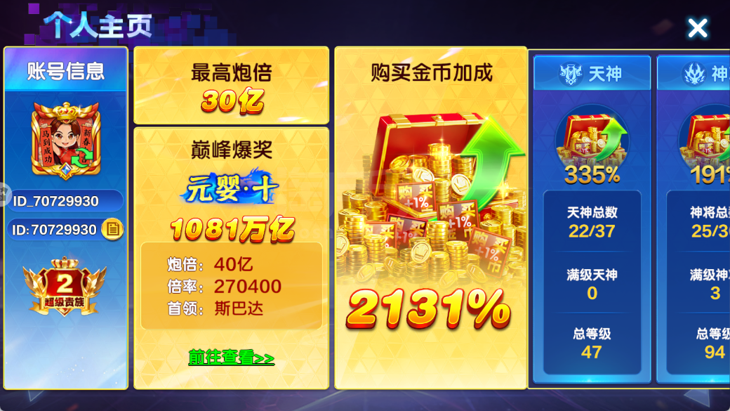 大咖华为版本-全可换绑-高配超级贵族2-加成2132两个副炮-天神羁绊新-道具用不完!-详情看图