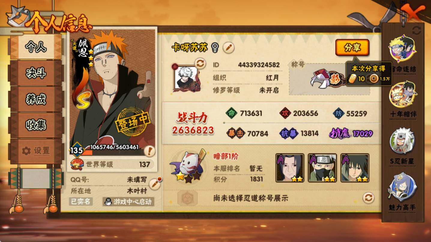 【S级忍者】:宇智波鼬「须佐能乎」(3星),自来也「舞之豪杰」(3星),波风水门(3星),佩恩「天道」(3星),漩涡鸣人·宇智波佐助(3星)