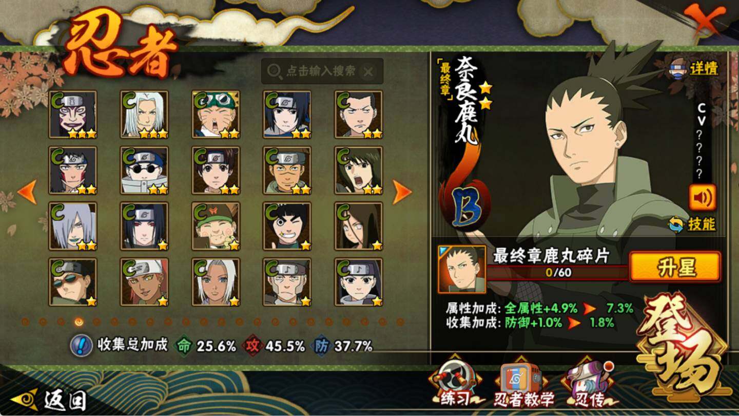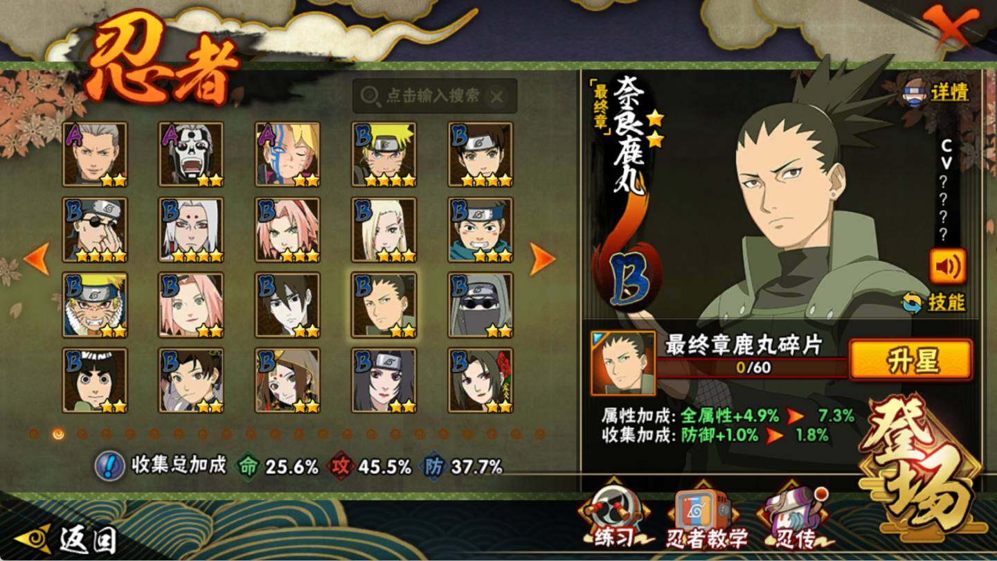 【S级忍者】:宇智波斑「秽土转生·解」(3星),艾「忍界大战」(3星),宇智波鼬「须佐能乎」(3星),自来也「舞之豪杰」(3星),波风水门(3星),佩恩「天道」(3星),漩涡鸣人·宇智波佐助(3星)