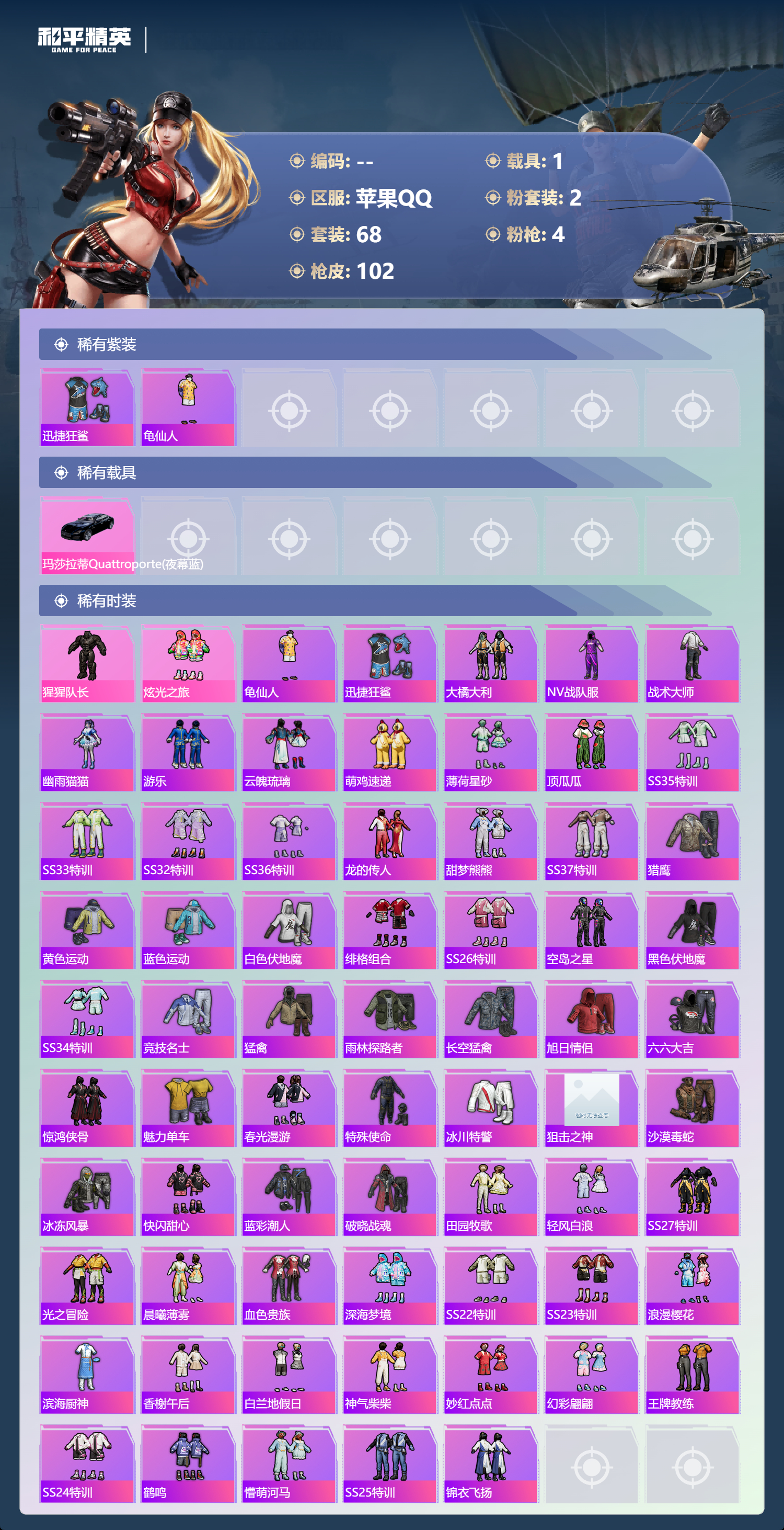 hs67321 苹果手Q-3王牌印记-2粉装-4特效枪-1载具-30323热力值-68套装-102枪皮-1卓越印记