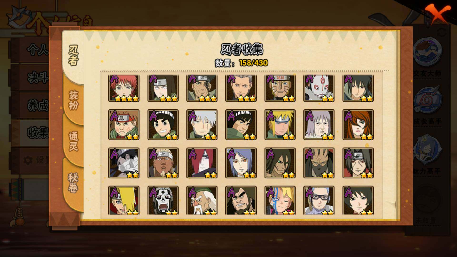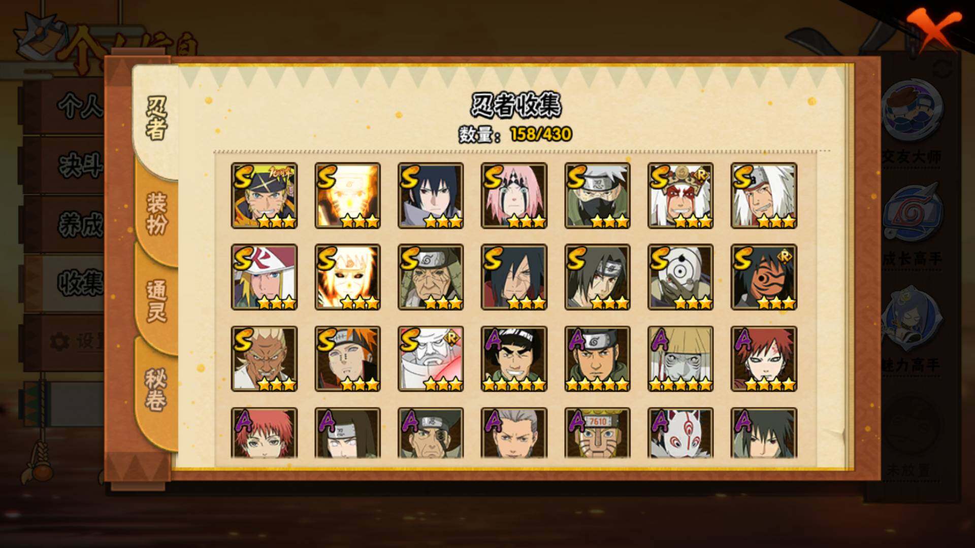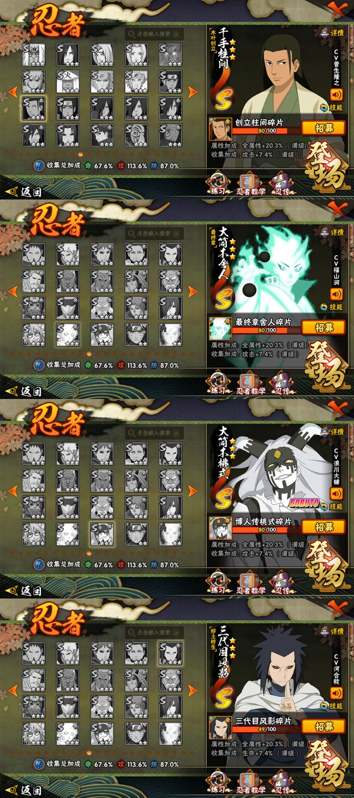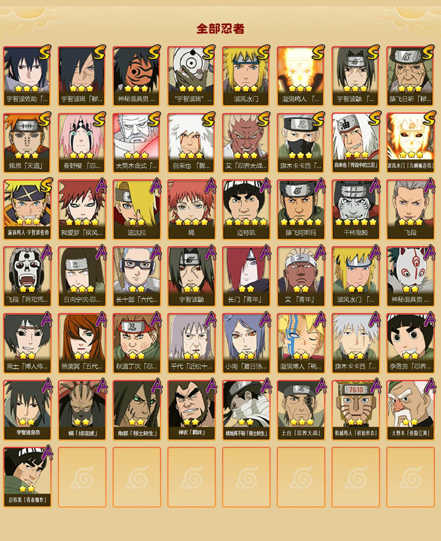 【S级忍者】:猿飞日斩「秽土转生」(3星),宇智波斑「秽土转生·解」(3星),春野樱「忍界大战」(3星),艾「忍界大战」(3星),宇智波鼬「须佐能乎」(3星),旗木卡卡西「须佐能乎」(3星),自来也「舞之豪杰」(3星),自来也「传说中的三忍