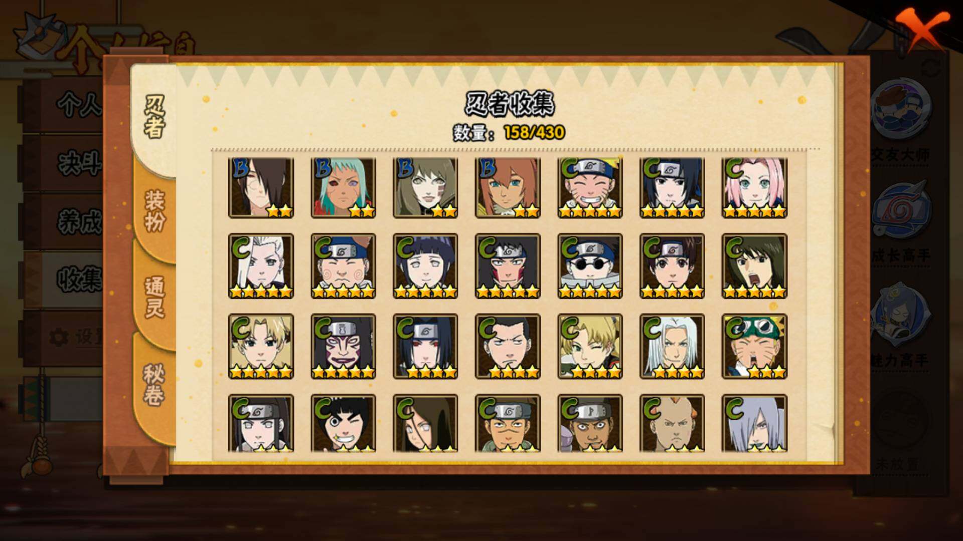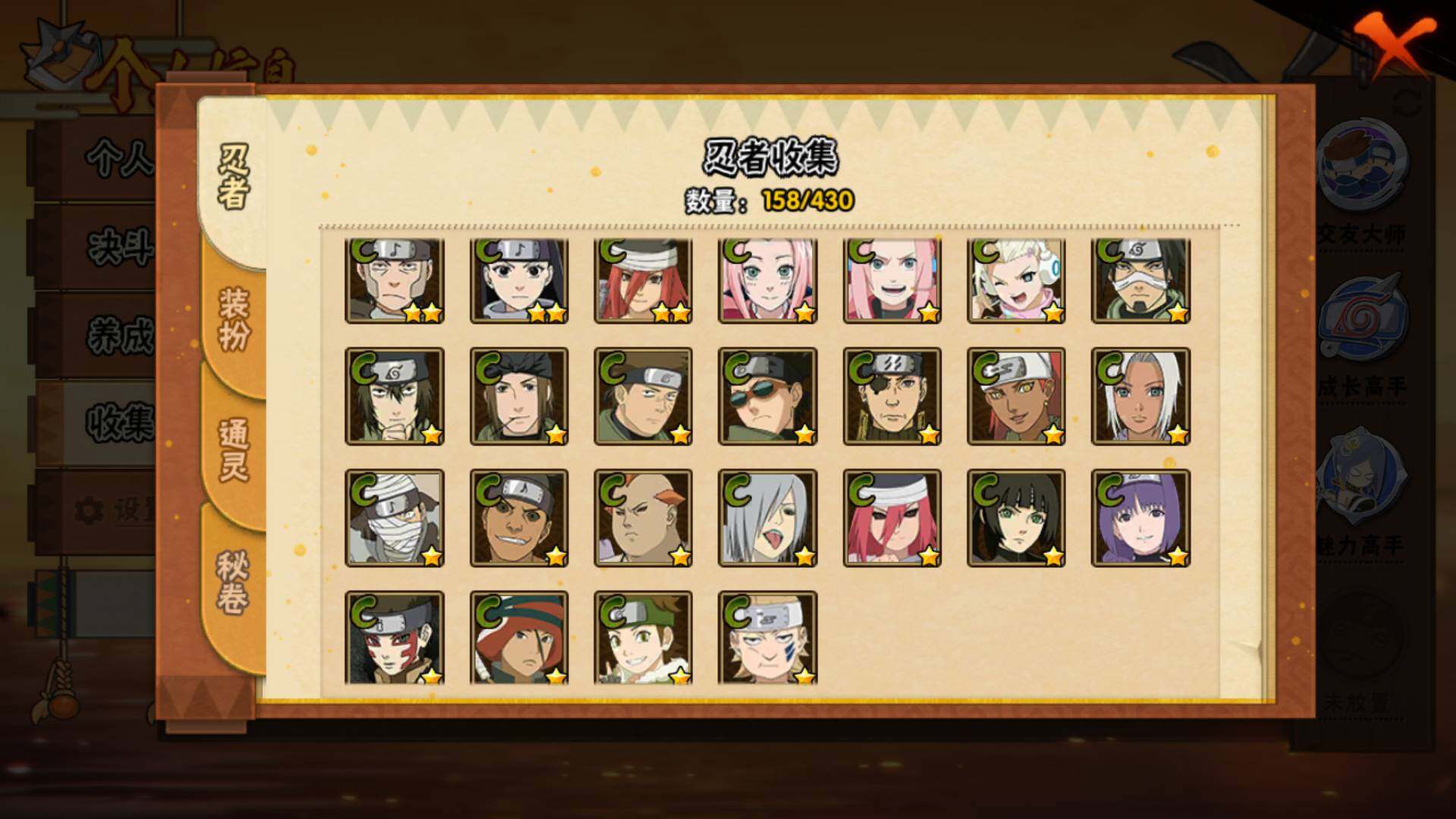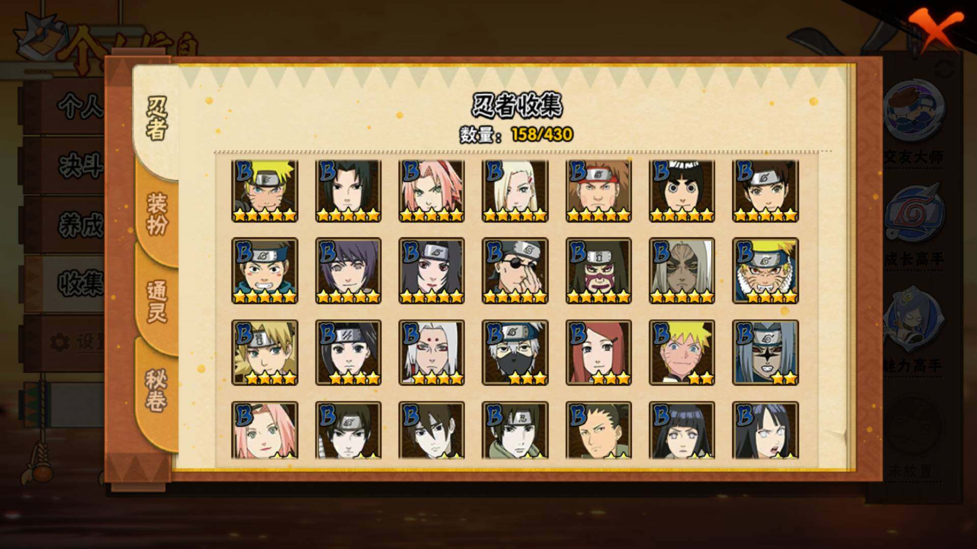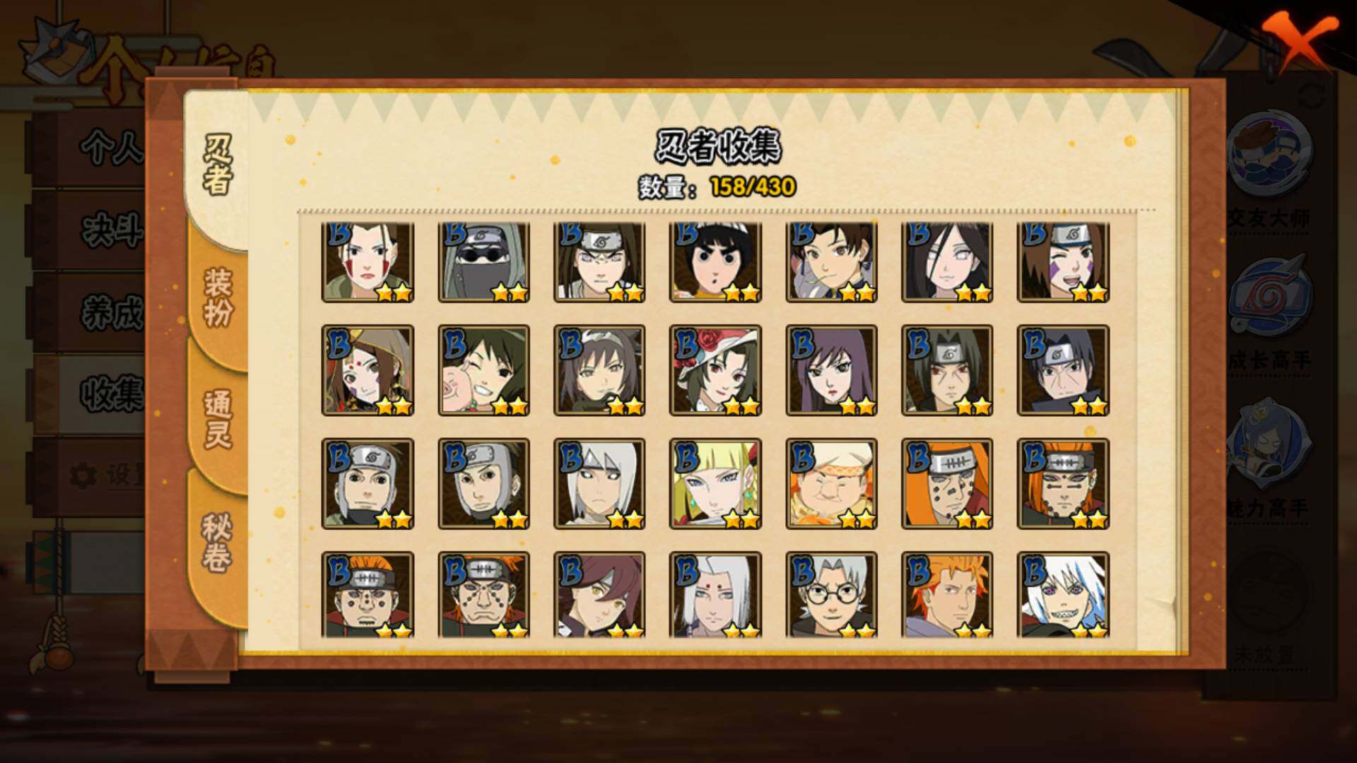 【S级忍者】:猿飞日斩「秽土转生」(3星),宇智波斑「秽土转生·解」(3星),春野樱「忍界大战」(3星),艾「忍界大战」(3星),宇智波鼬「须佐能乎」(3星),旗木卡卡西「须佐能乎」(3星),自来也「舞之豪杰」(3星),自来也「传说中的三忍