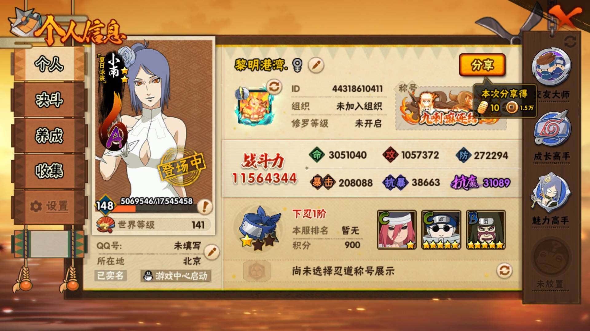 V9 17S 32A 1156万战力 5700金币 热门A面麻 泳装小南 侠隐大野木 S碎片创立柱间80片 舍人80片 桃式80片 风影49片。YY2086