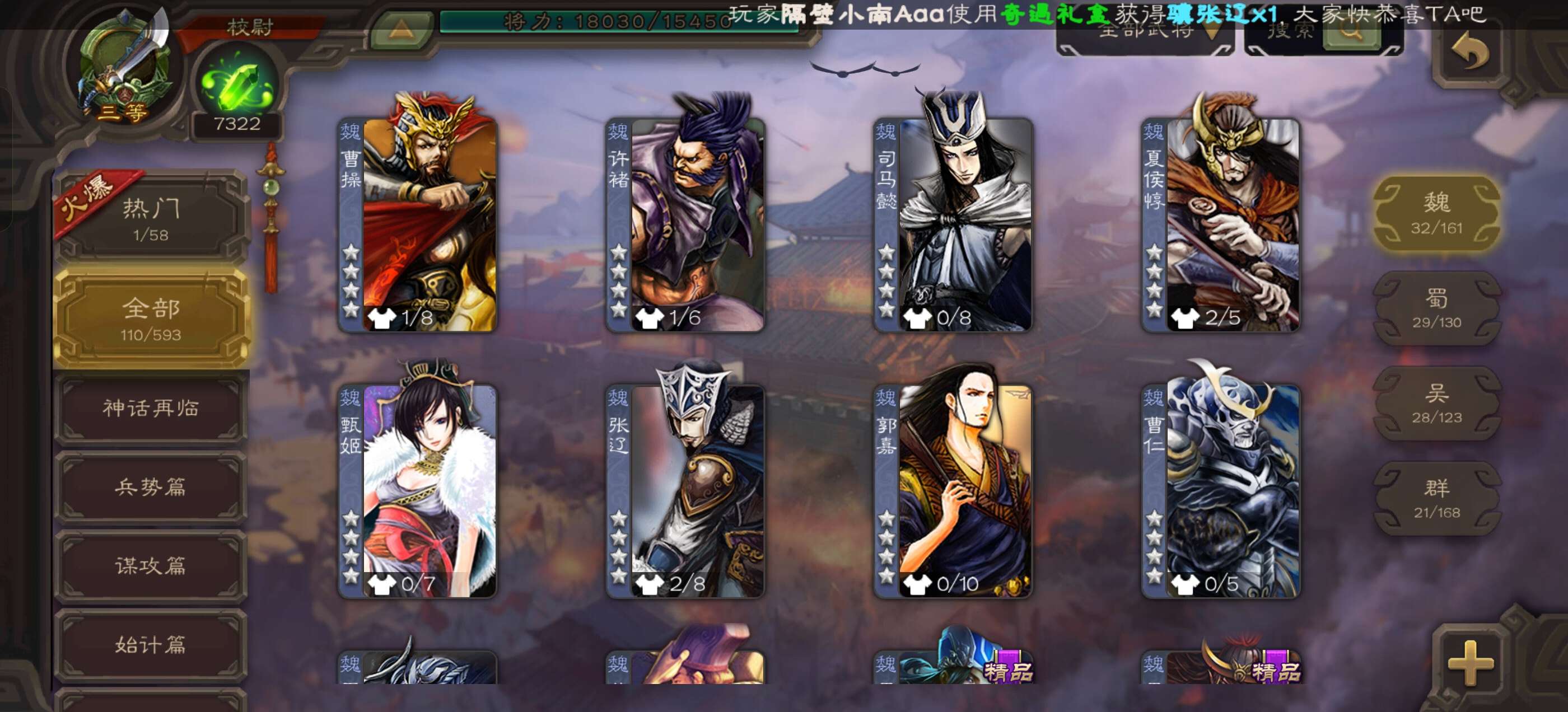 官阶:中军将军;VIP等级:VIP8;史诗武将数量:7;动态皮肤数量:3;武将总数:197;史诗宝珠数量:3;将魂数量:373;神将:0;魏国史诗武将:2;蜀国史诗武将:2;吴国史诗武将:1;群史诗武将:2