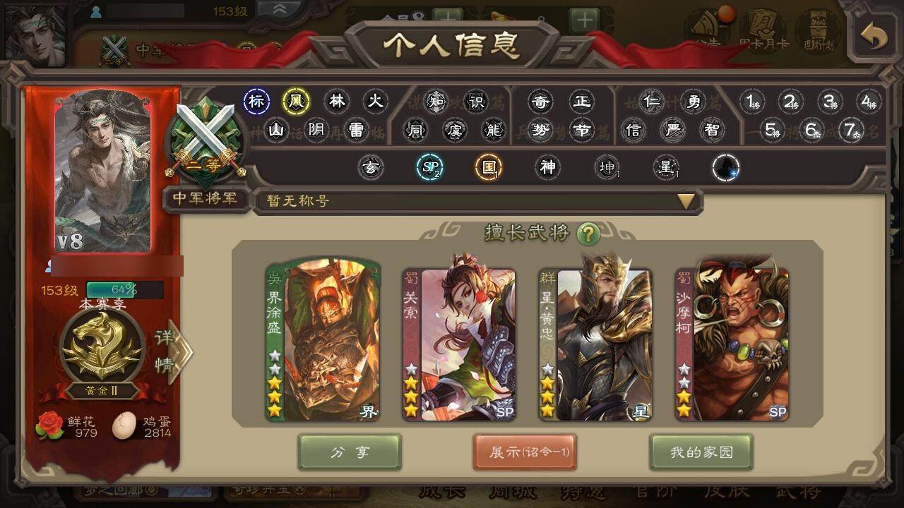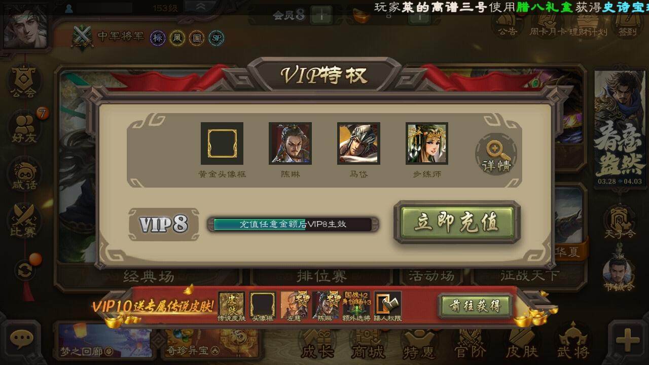 官阶:中军将军;VIP等级:VIP8;史诗武将数量:7;动态皮肤数量:3;武将