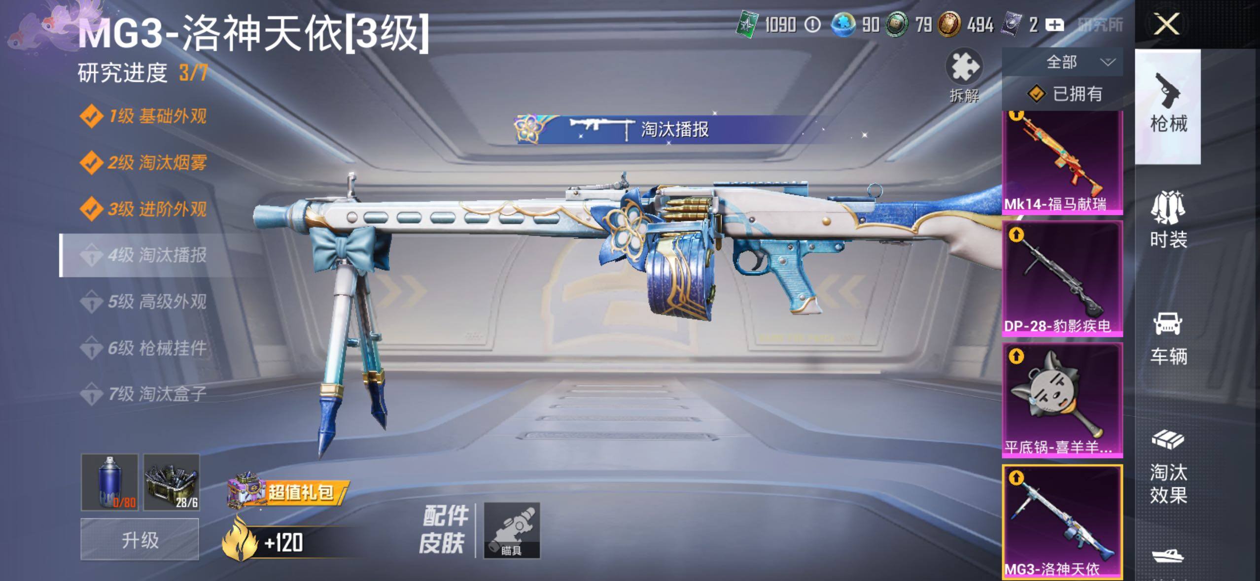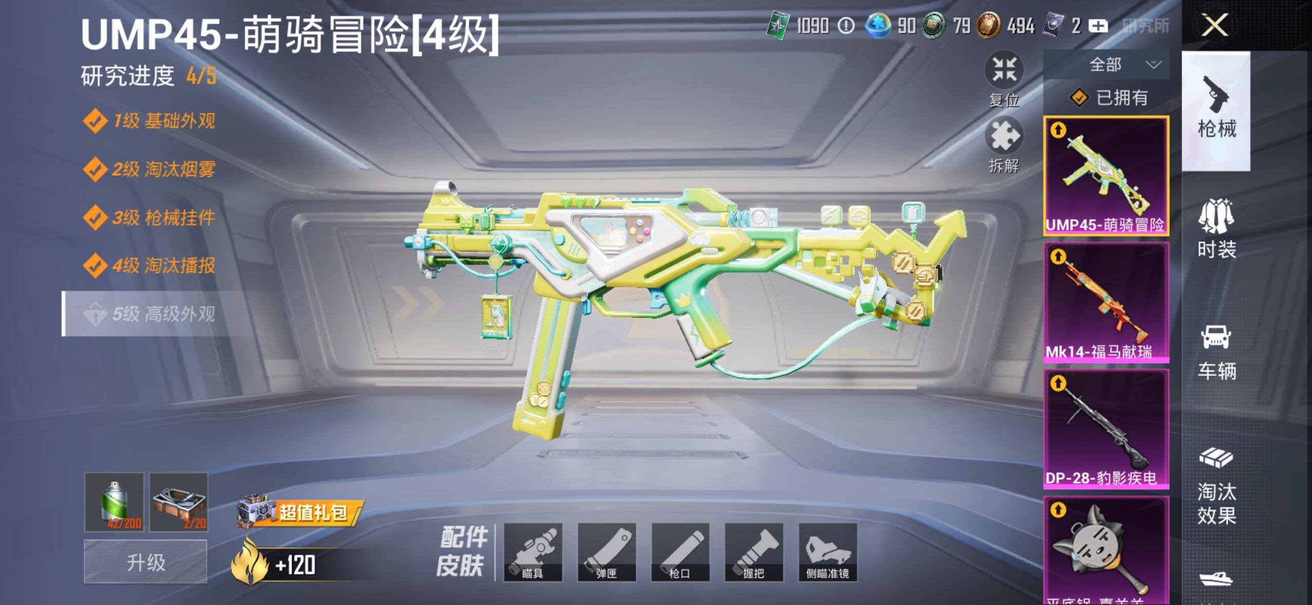 【粉色枪皮等级】:UMP45-萌骑冒险(四级),Mk14-福马献瑞(五级),DP-28-豹影疾电(五级