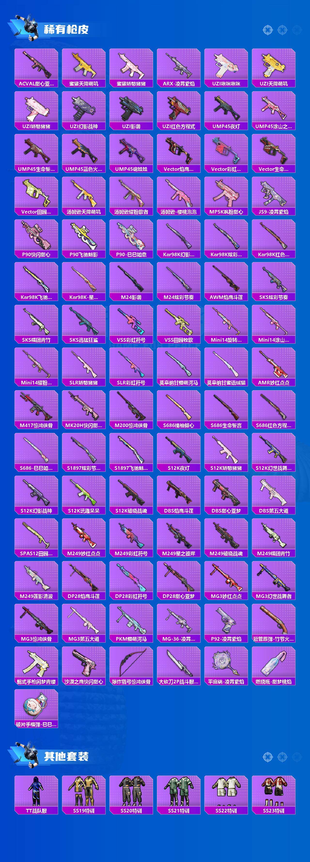 【粉色枪皮等级】:AKM-绿萝繁花(五级),SCAR-L-锦绣绵绵(五级),ACE32-萌骑漫游(三级),UMP45-萌骑冒险(五级),AKS-74U-森灵之息(四级),Kar98K-巳巳如意(五级),Mk14-甜梦熊击(五级),Mk14-福马献瑞(二级),DP-28-豹影疾电(五级),MG-36-