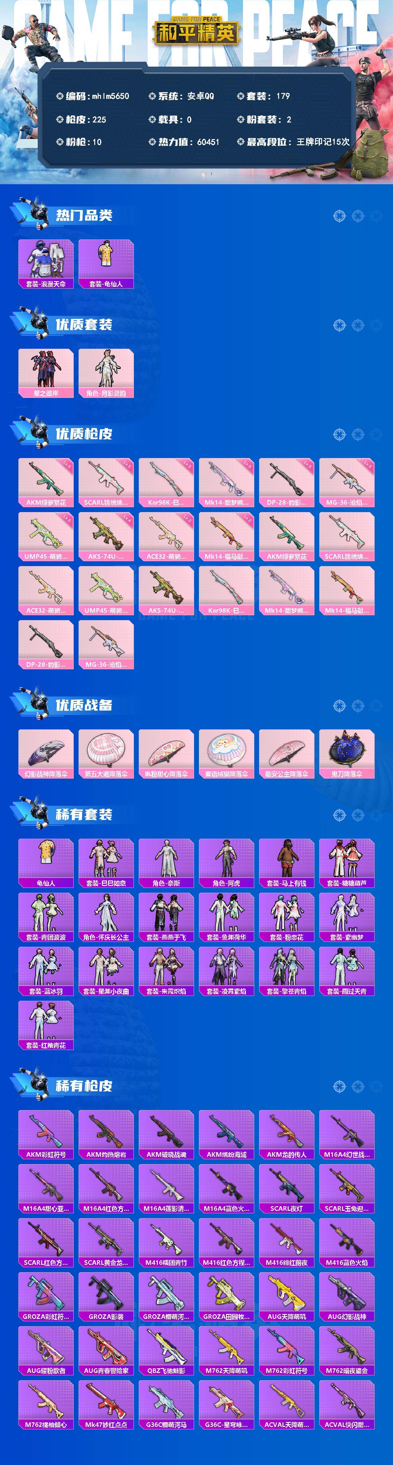 安卓 手Q-2粉装-10特效枪-0载具-0粉色飞行器-60451热力值-15王牌印记-179套装-225枪皮