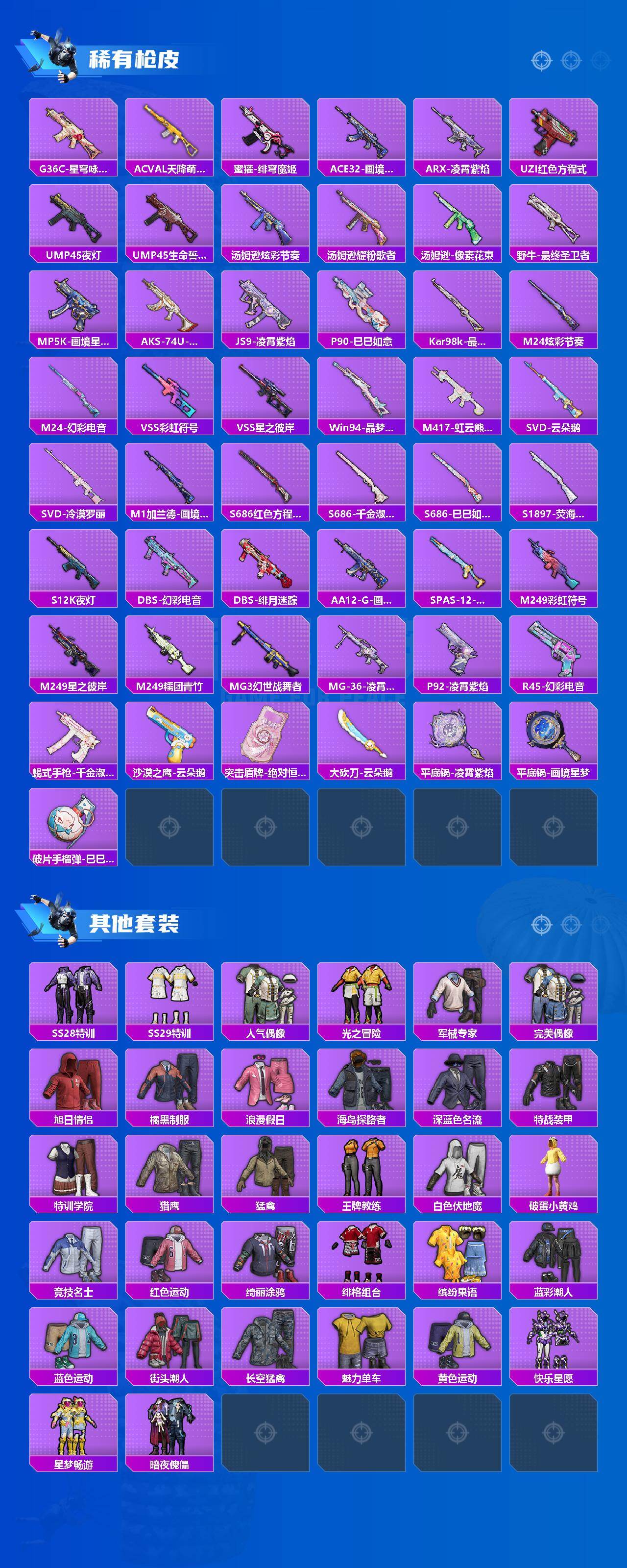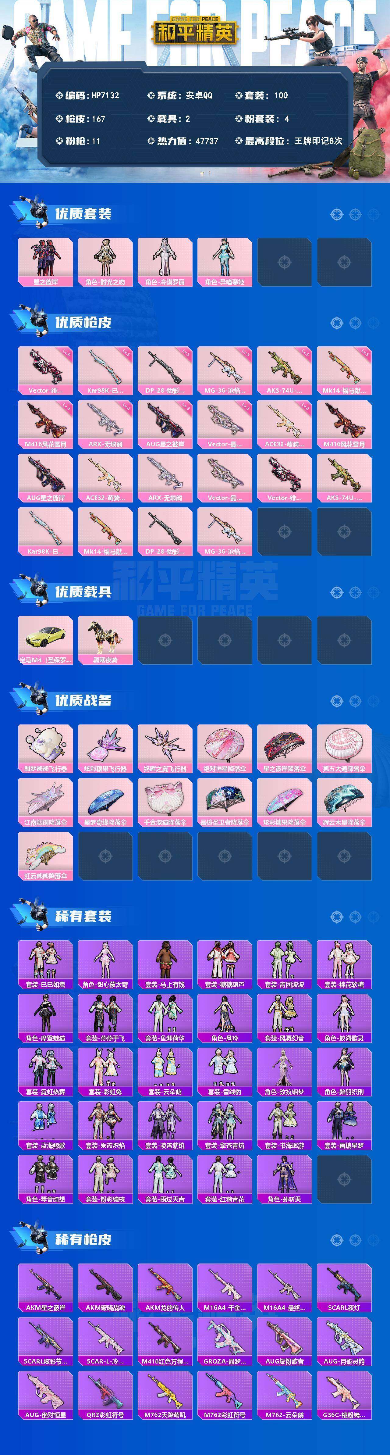 (4粉套11粉枪2载具)地铁满天赋/星之彼岸/时光之吻/冷漠罗丽/异瞳寒姬/M416风花雪月四级/AUG星之彼岸三级/ACE32萌骑漫游三级/ARX无垠阁四级/Vector最终圣卫者三级/Vector绯穹魔姬六级/AKS74U森灵之息五级/Kar98K巳巳如意五级/Mk14福马献瑞五级/DP28豹影疾电五级/MG36沧焰双生五级/宝马圣保罗黄/黑曜夜骑/没战神框/HP7132-3粉色飞行器-47