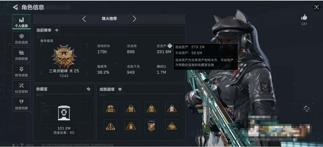 总资产(M):331M/哈夫币(K):39407K/传说枪皮数:51/全面战场等级:30_段位:军士长/烽火地带等级:60_段位:三角洲巅峰/