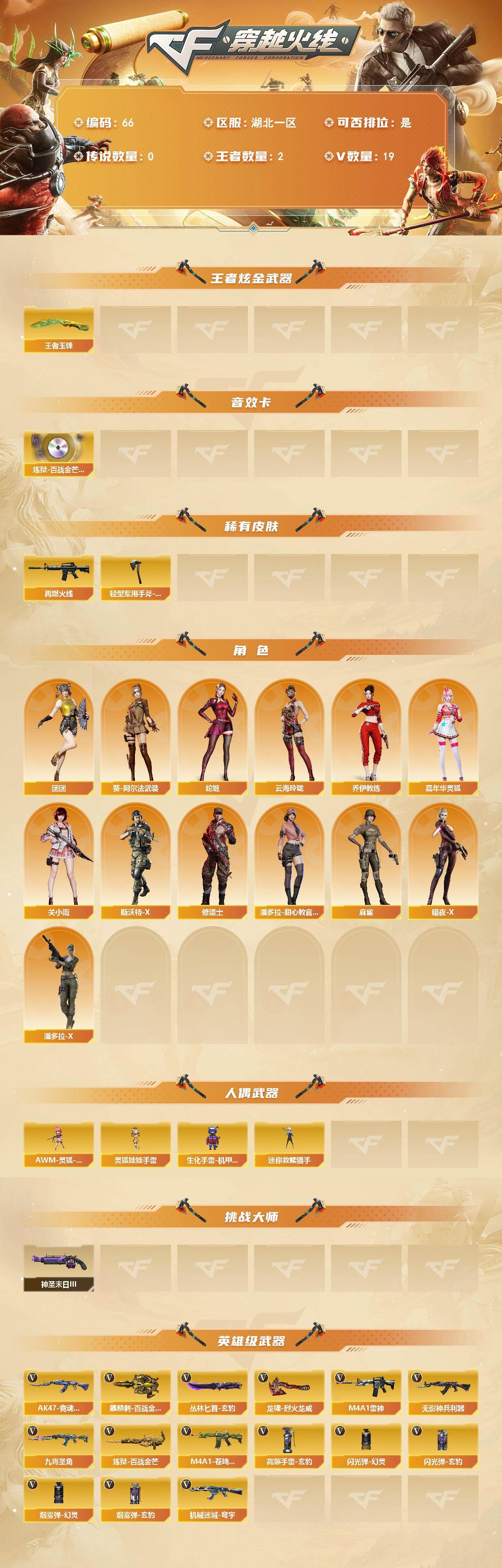 【特价出售·手慢无】湖北一区-19V-2王者武器数-0炫金武器数