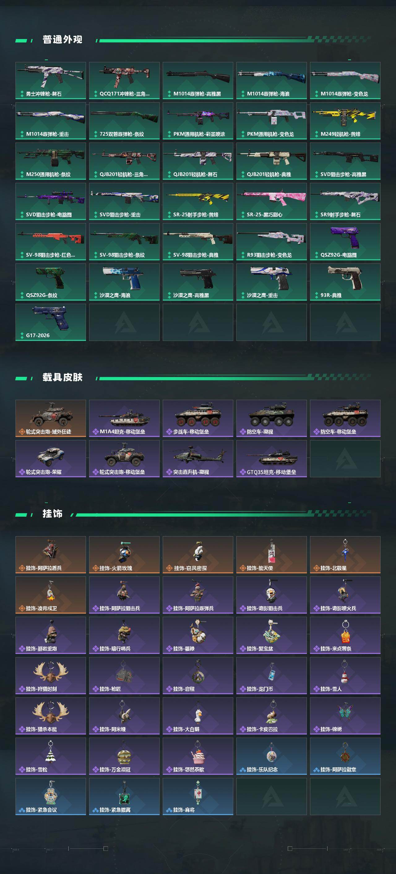 【传说外观】:M4A1突击步枪-阿米娅,AKM突击步枪-锦绣,QBZ95-1突击步枪-凌霄戍卫,ASh-12战斗步枪-鹅鸭