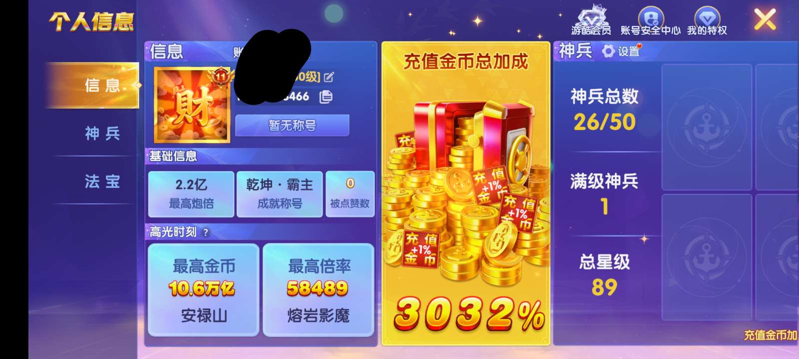 乐乐捕鱼vip5+226万亿金币+3.2亿实炮!4级万象!3个羁绊!已解绑带号一起出