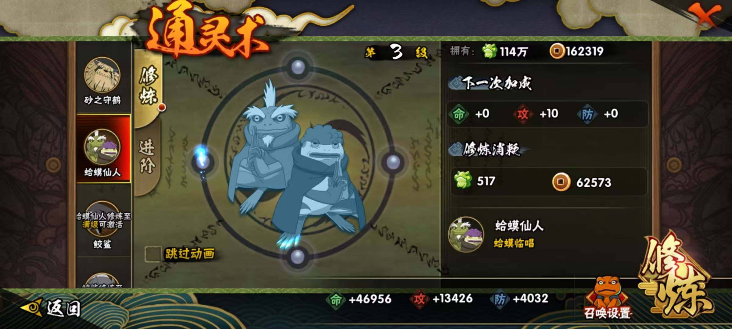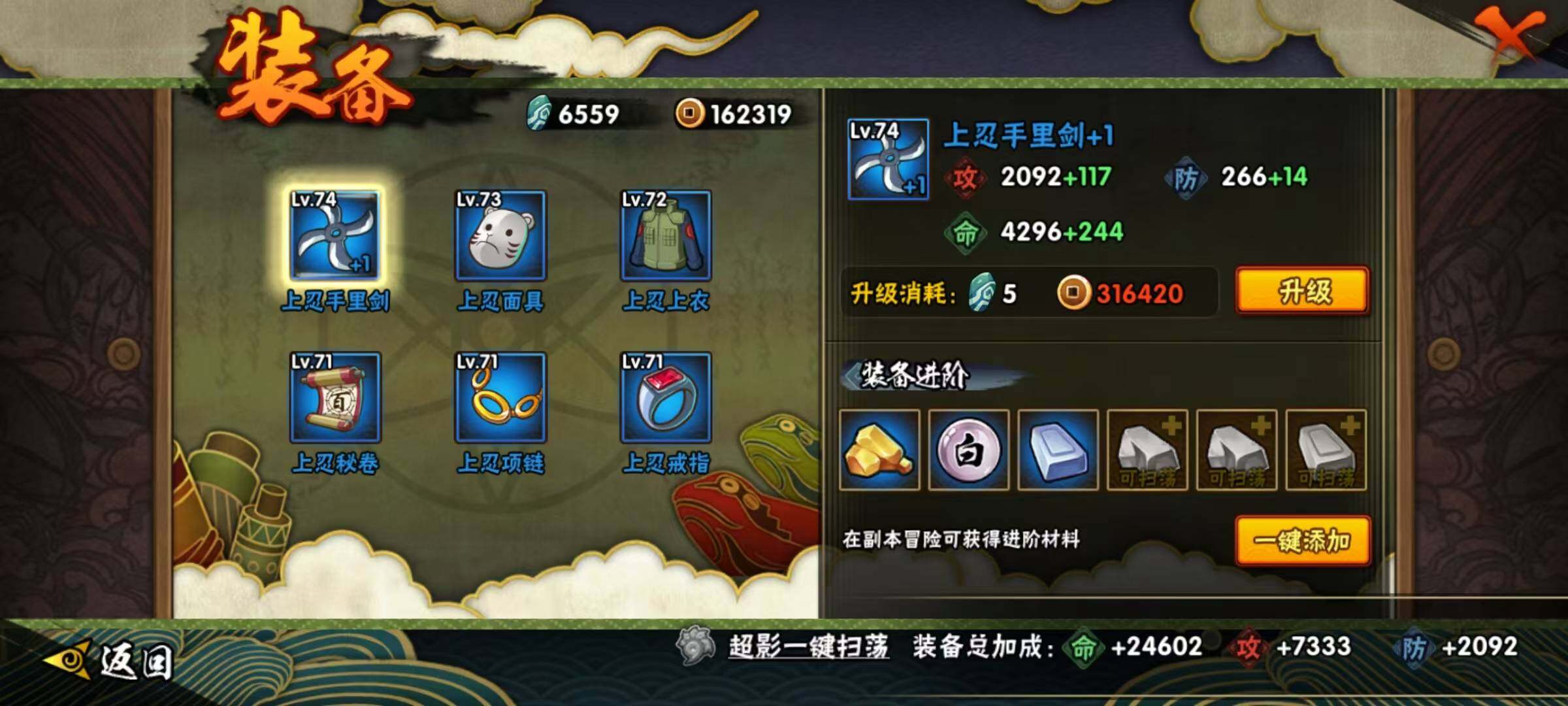 【S级忍者】:宇智波鼬「须佐能乎」(3星),自来也「舞之豪杰」(3星),佩恩「天道」(3星),宇智波佐助「永恒万花筒」(3星)