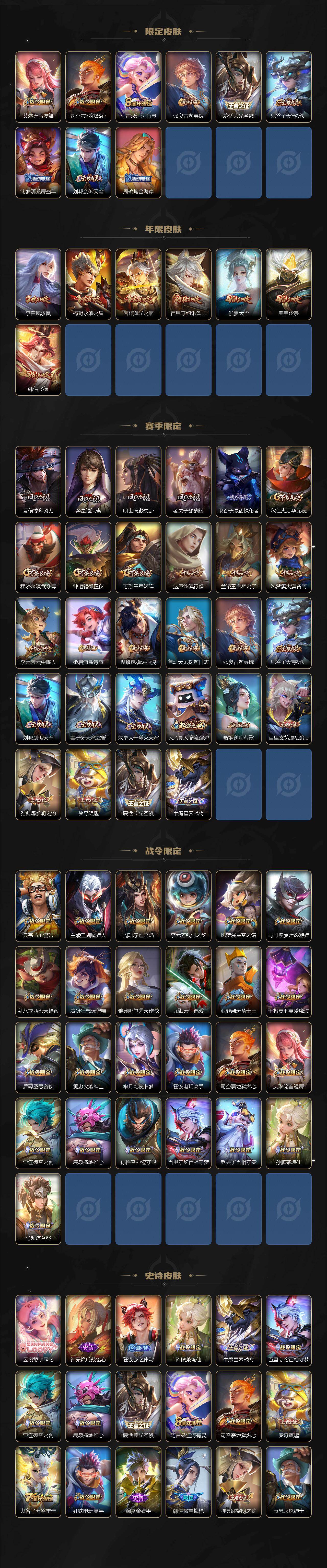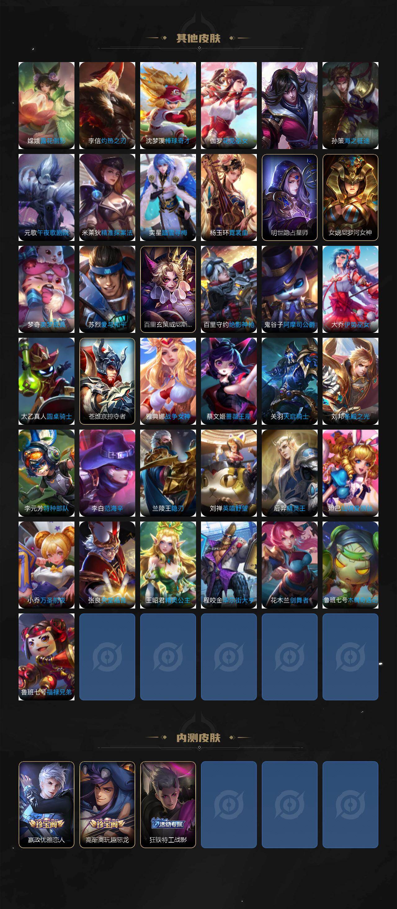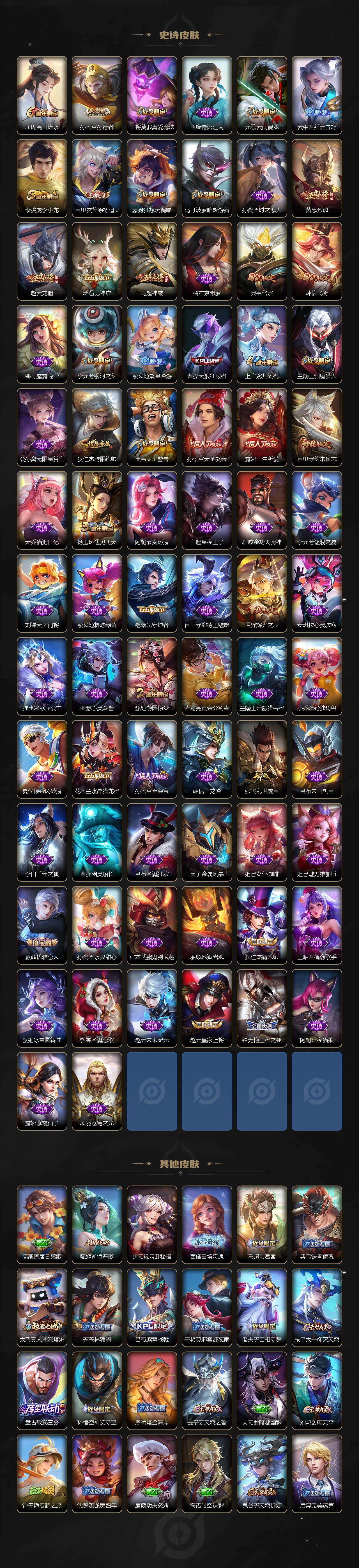 【传说皮肤】:司马懿九山相柳,桑启鸣野蒿,孙策挚爱之约,曜李逍遥 ,镜炽阳神光,虞姬启明星使,孙悟空零号赤焰,关羽武圣,刘备时之恋人,伽罗太华,貂蝉猫影幻舞,干将莫邪久胜战神,达摩黄金狮子座,花木兰冠军飞将,后羿黄金射手座,杨戬永曜之星,诸葛亮武陵仙