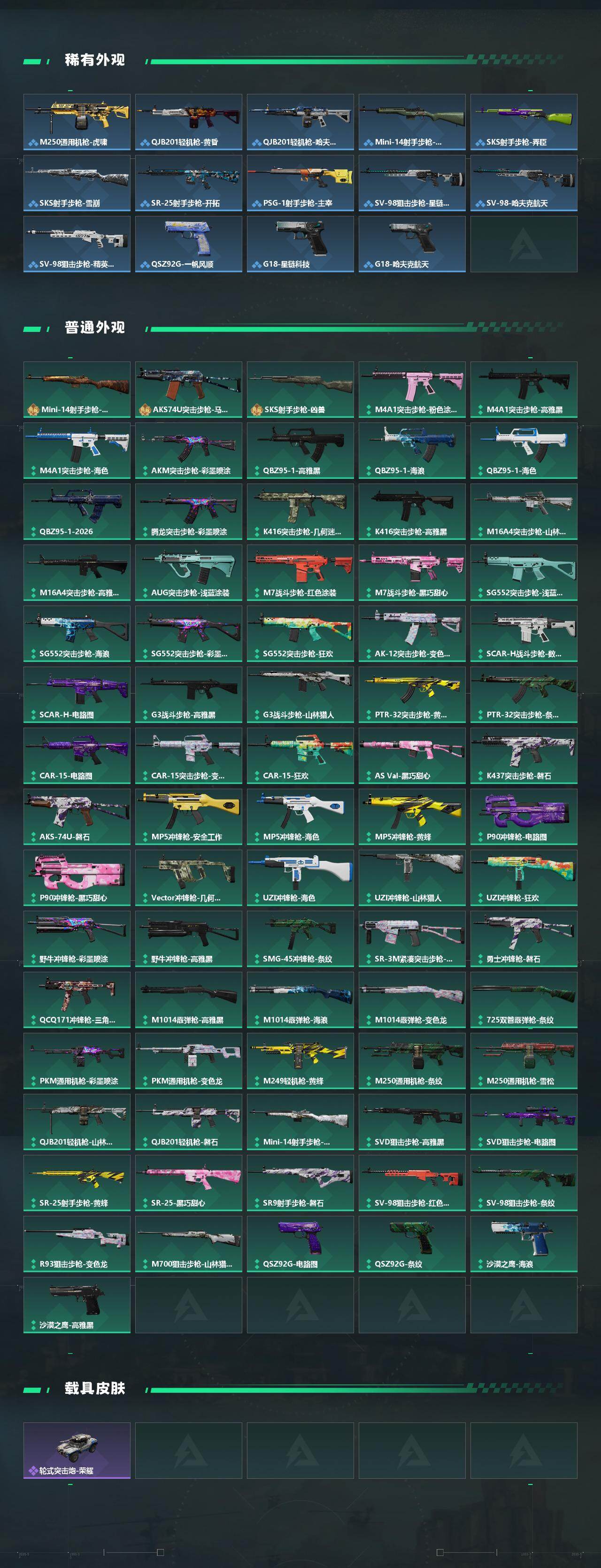 【传说外观】:M4A1突击步枪-蚀金玫瑰,M4A1突击步枪-阿米娅,QBZ95-1突击步枪-凌霄戍卫,ASh-12战斗步枪-鹅鸭杀,SG552突击步枪-运动员,AK-12突击步枪-特斯拉线圈,SCAR-H战斗步枪-