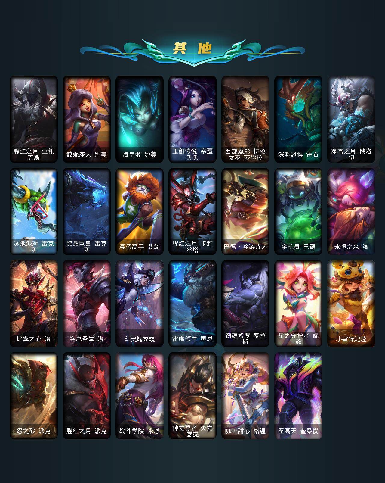 【神话皮肤】:十周年纪念安妮,源代码乐芙兰,水晶圣骑艾希,新卧虎藏龙贾克斯,灰烬杀手塞拉斯