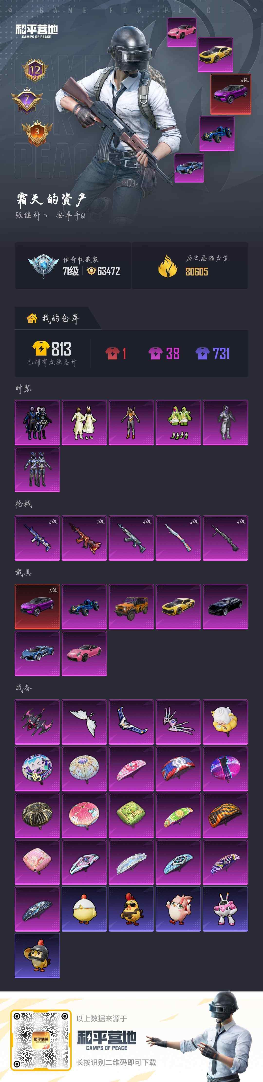 安卓 手Q-6粉装-5特效枪-7载具-4粉色飞行器-80605热力值-12王牌印记-157套装-239枪皮