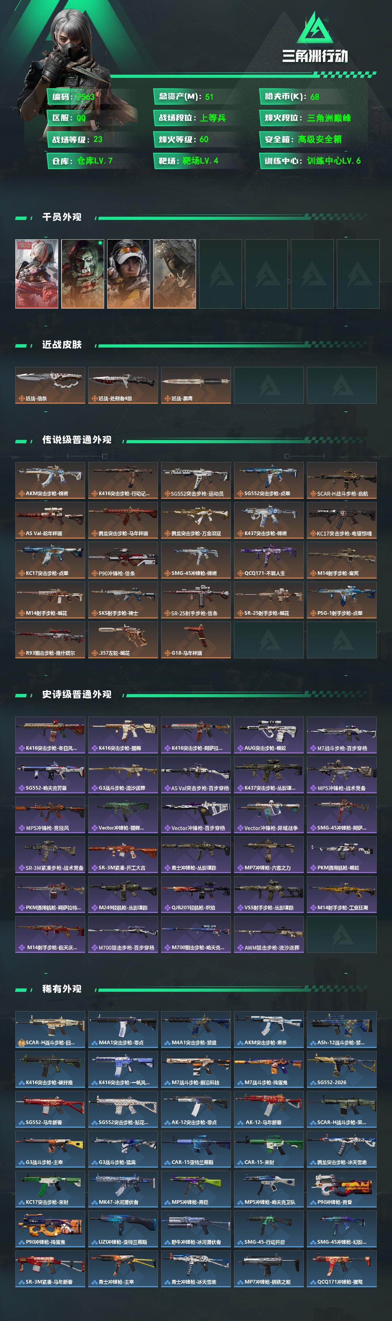 {特价出售}{可二次实名}等级:60总资产:51.2M 纯币68547 红皮:骇爪-维什戴尔/乌鲁鲁-荒原猎手/露娜-金牌射手/红狼-电锯惊魂 刀皮: 近战-信条/近战-处刑者4级 特勤处:仓库7,训练6,靶场4