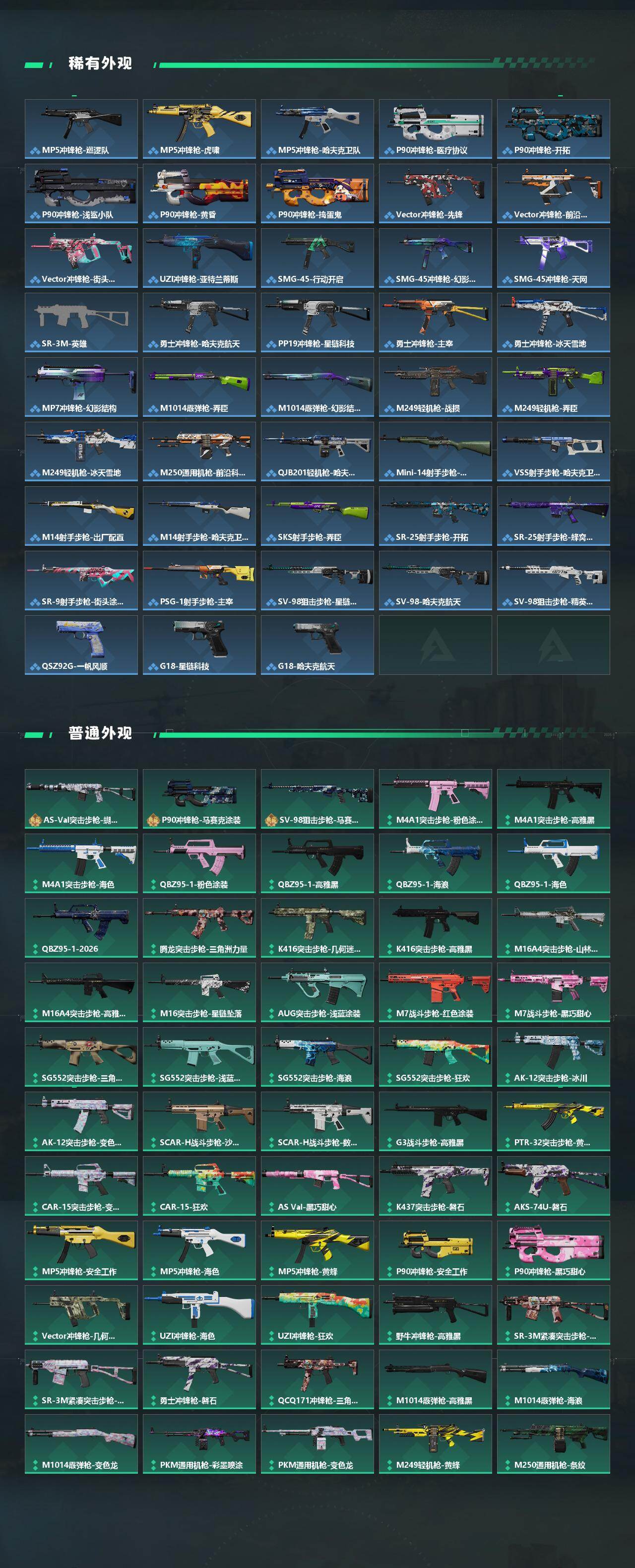 【传说外观】:M4A1突击步枪-蚀金玫瑰,M4A1突击步枪-阿米娅,AKM突击步枪-锦绣,ASh-12战斗步枪-鹅鸭杀,M7战斗步枪-神秘艺术,SG552突击步枪-运动员,SCAR-H战斗步枪-启航,腾龙突击步枪-捞点薯条,K437突击步枪-锦绣,KC17突击步枪-电锯惊魂,P90冲锋枪-神秘艺术,SMG-45冲