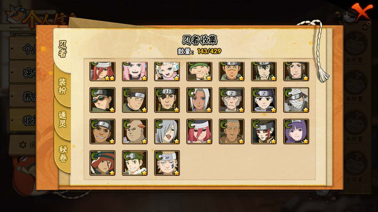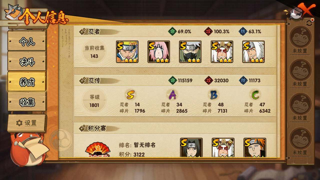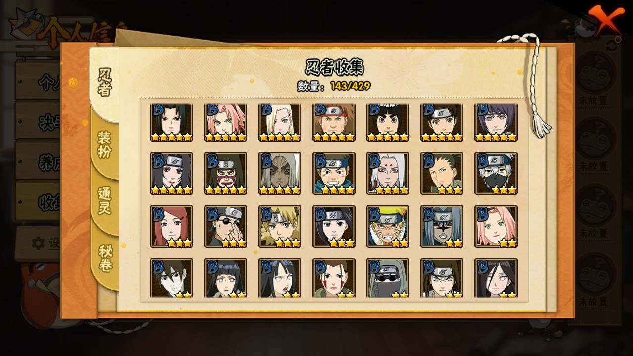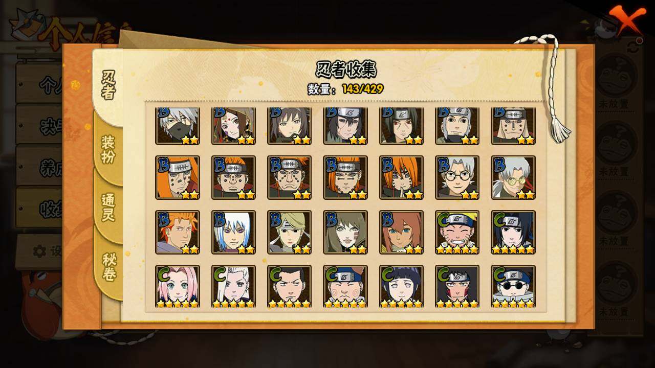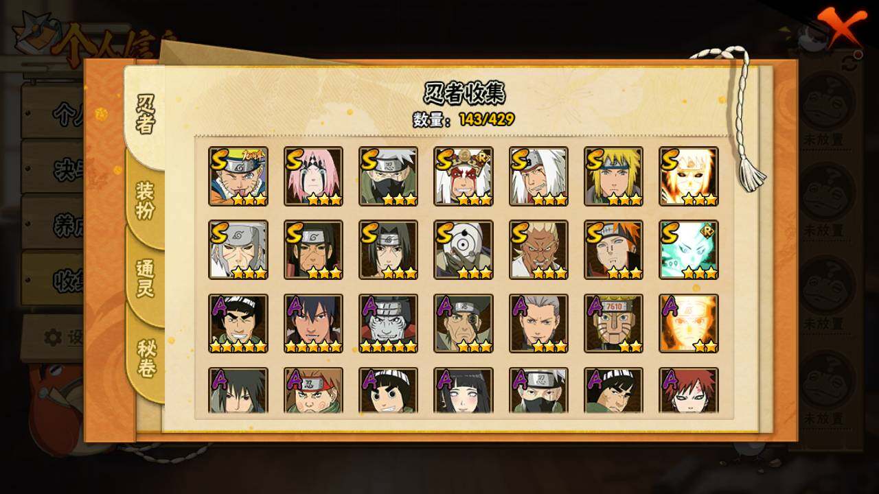 【S级忍者】:千手扉间「秽土转生」(3星),千手柱间「秽土转生」(3星),春野樱「忍界大战」(3星),艾「忍界大战」(3星),宇智波鼬「须佐能乎」(3星),旗木卡卡西「须佐能乎」(3星),自来也「舞之豪杰」(3星),自来也「传说中的三忍」(3星),波风水门(3星),佩恩「天道」(3星),宇智波斑 「白面具」(3星宇智