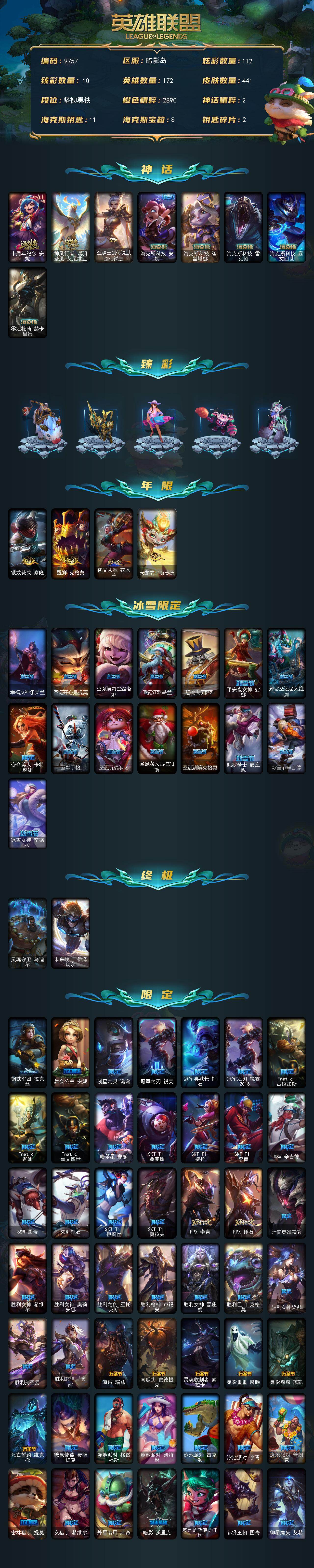 未定级段位-172英雄-441皮肤-112炫彩-2终极-8神话-71限定-