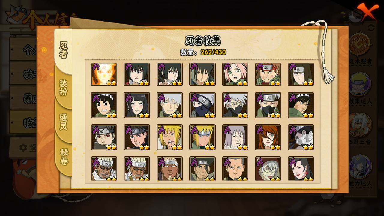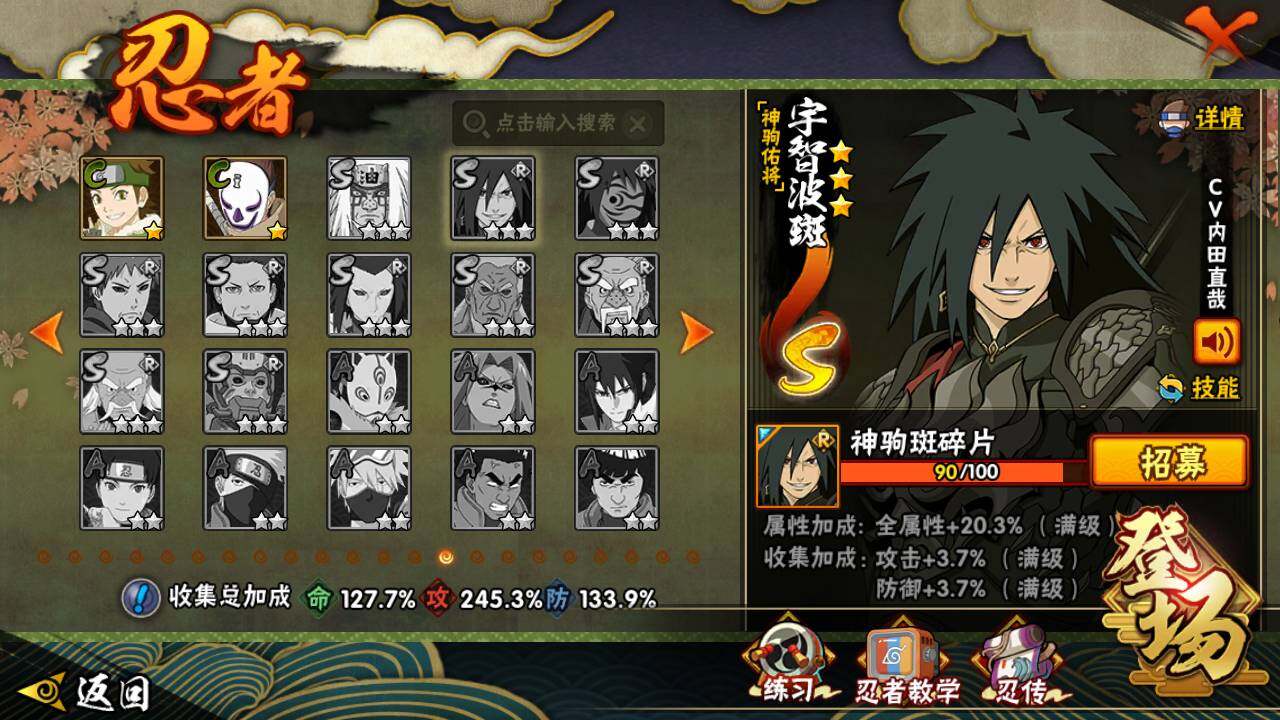 【S级忍者】:长门「秽土转生」(3星),金角·银角「秽土转生」(3星),猿飞日斩「秽土转生」(3星),波风水门「秽土转生」(3星),千手扉间「秽土转生」(3星),千手柱间「秽土转生」(3星),宇智波鼬「秽土转生」(3星),宇智波斑「秽土转生」(3星),宇智波斑「秽土转生·解」(