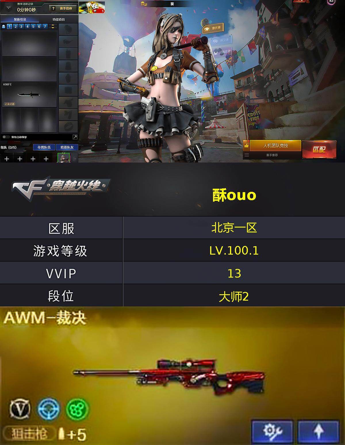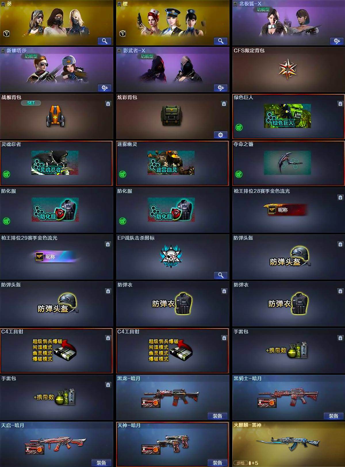 北京一区-13V-1王者武器数-0炫金武器数【热门武器】:死亡之眼*3【王者炫金武器】:天启-悦智【皮肤】:火麒麟-雷神,黑龙-暗月,黑骑士-暗月,天启-暗月,天神-暗月【角色】:葵,樱,北极狐-X,新娜塔莎,影武者-X【暴走生化】:死亡之眼*3【挑战大师】:激光毁灭者III,阐释者III【英雄级武器】:AK47-火麒麟,M4A1-死神,AK47-黑武士,M4A1-玫瑰精灵,AWM-天龙,Barrett-毁灭,Barrett-极光,AWM-裁决,沙鹰-天神,屠龙,擎天【道具】:CFS限定背包,战