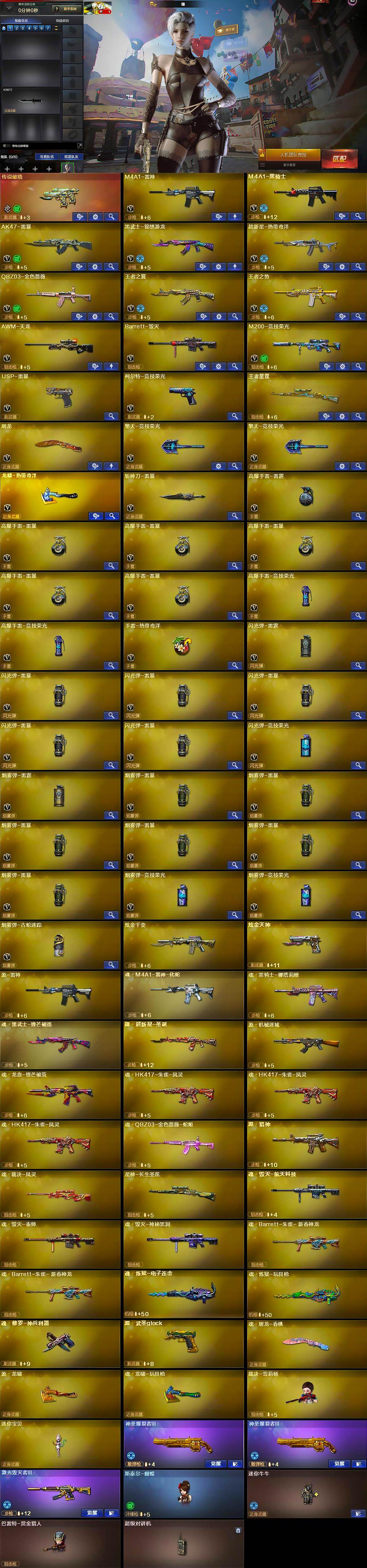 云南一区-46V-3王者武器数-2炫金武器数【传说武器】:传说破晓【热门武器】:传说破晓,QBZ03-金色蔷薇,M200-竞技荣光,M4A1-黑骑士,斯泰尔-蝴蝶,裁决-雪莉杨,USP-雷暴【王者炫金武器】:王者星霆,炫金千变,炫金天神【音效卡】:天神-动感闪耀 音效卡,M4A1-黑骑士音效卡【皮肤】:毁灭-黑大圣皮肤,毁灭-秦师 皮肤,黑武士-典韦皮肤,幻影-破浪逐光 皮肤【角色】:瞳,电竞教官-云悠悠,机械姬,王者影豹,蛇隐宗,奇洋探员,炽天使,电竞少女,芳心审判者,飞虎队-X,娟娟,猎狐者