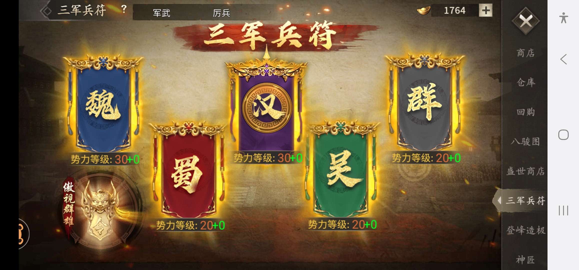 国一85万7层周瑜带鼎,魏武大帝 蜀汉皇帝等 觉醒拉满 阵法1个600 3个400 汉 魏旗30级