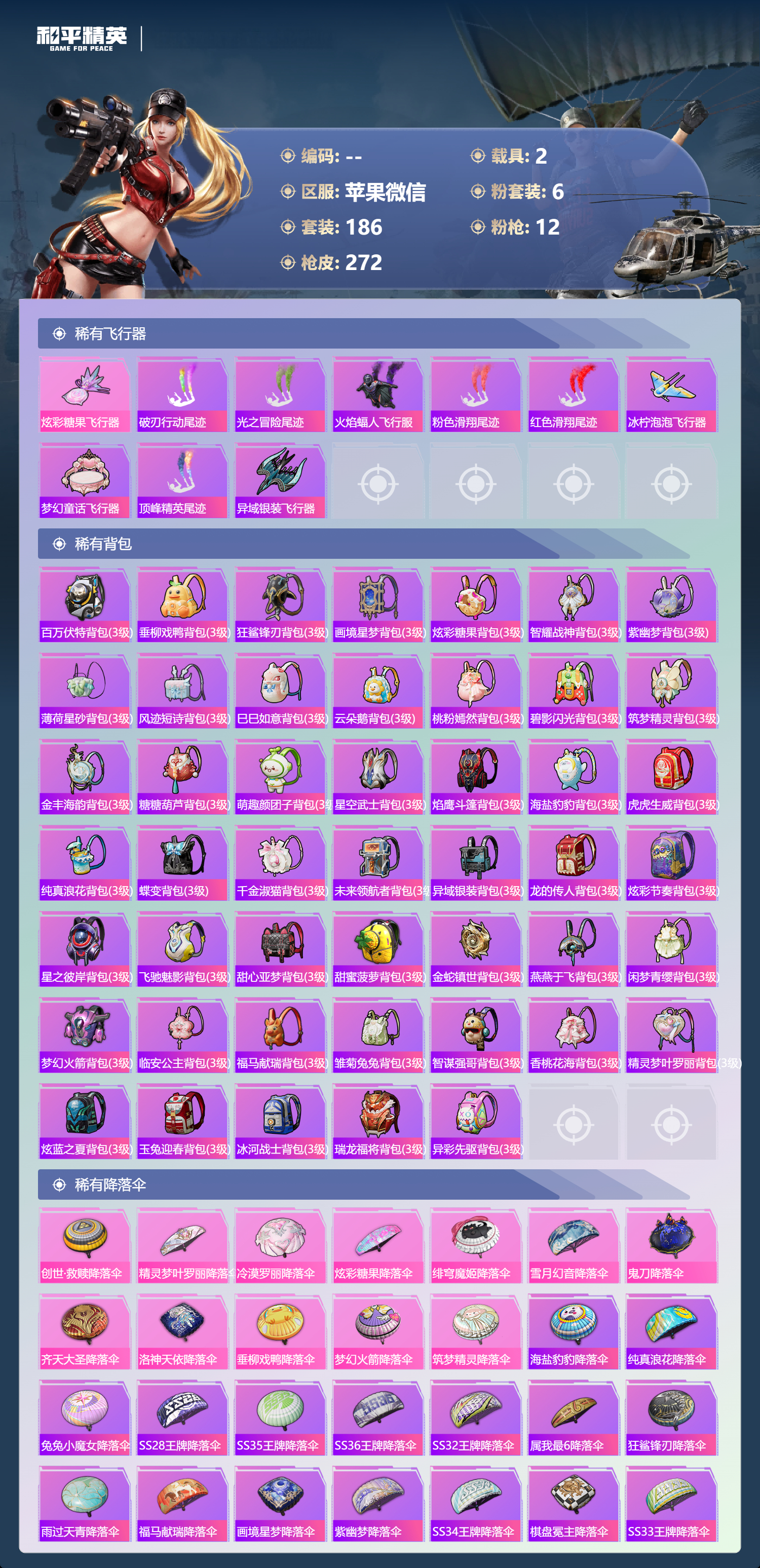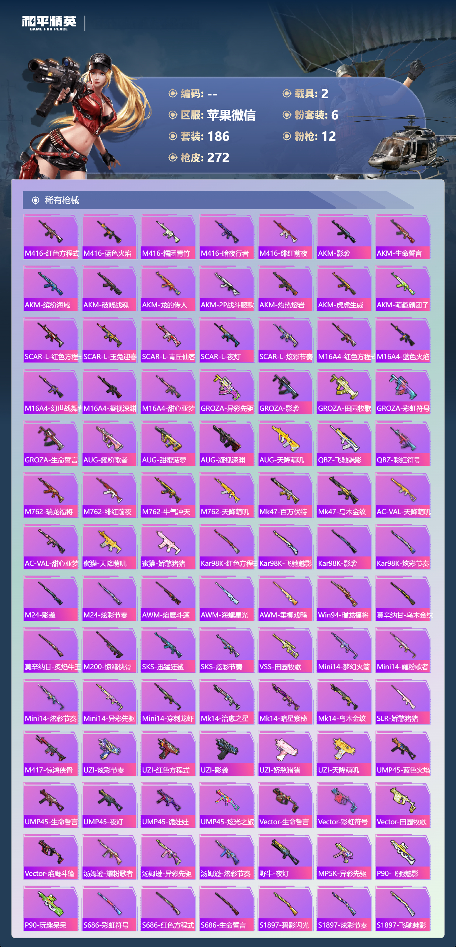hs67837 苹果微信-14王牌印记-6粉装-12特效枪-2载具-83831热力值-186套装-272枪皮-3卓越印记-1传奇印记