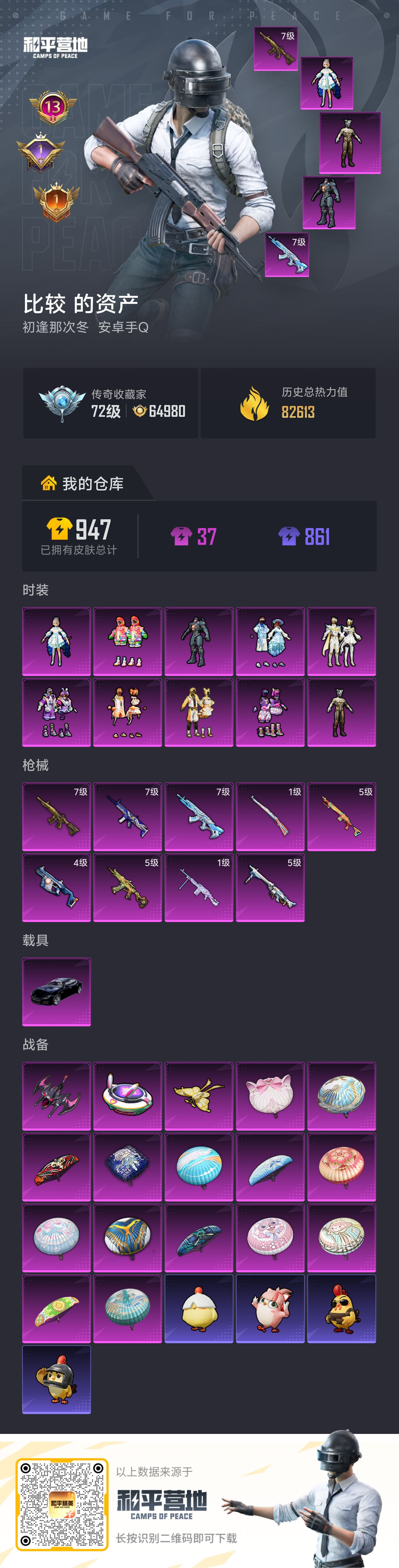 hs67291 安卓手Q-13王牌印记-10粉装-9特效枪-1载具-82613热力值-184套装-247枪皮-1卓越印记-1传奇印记