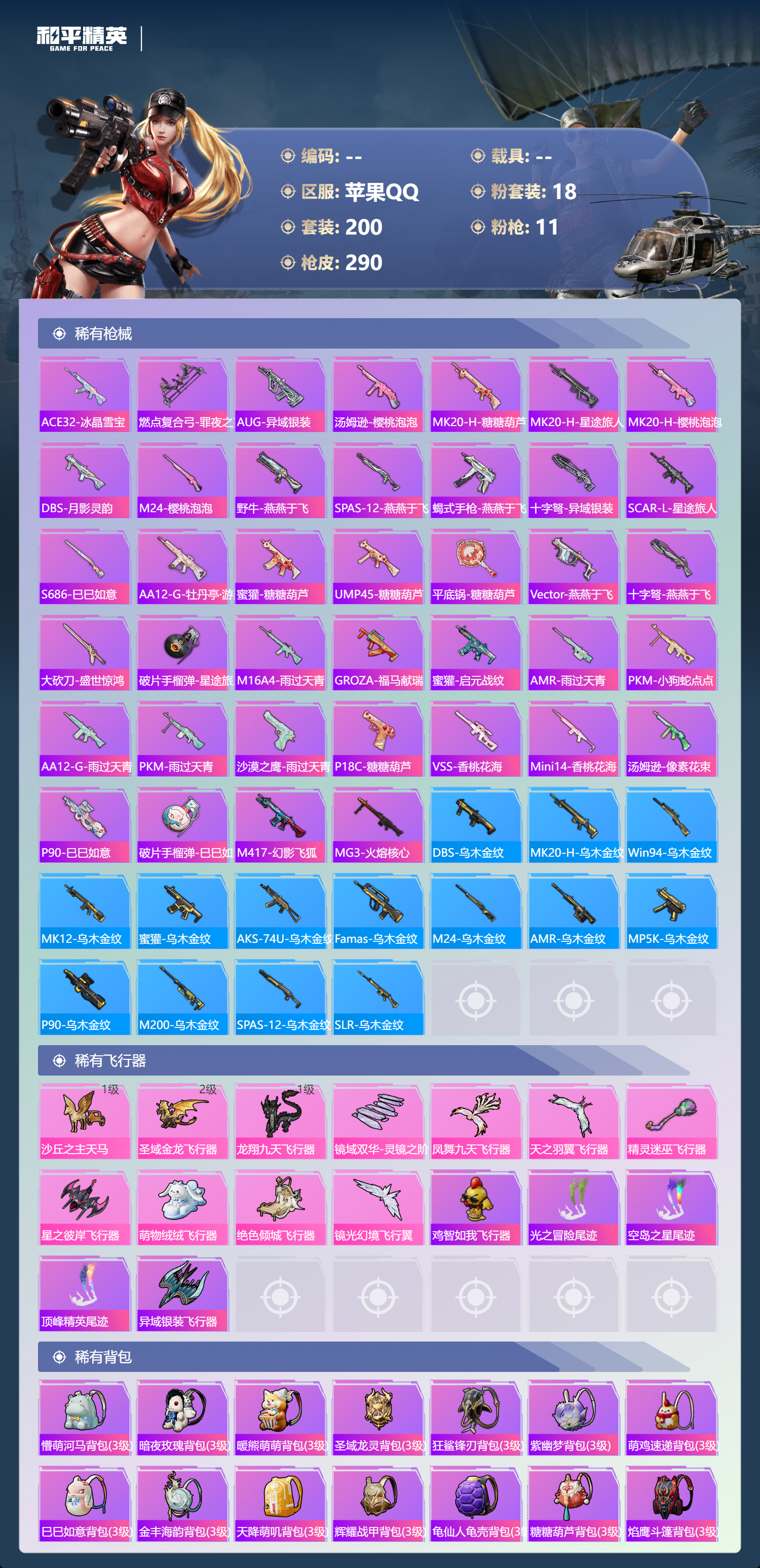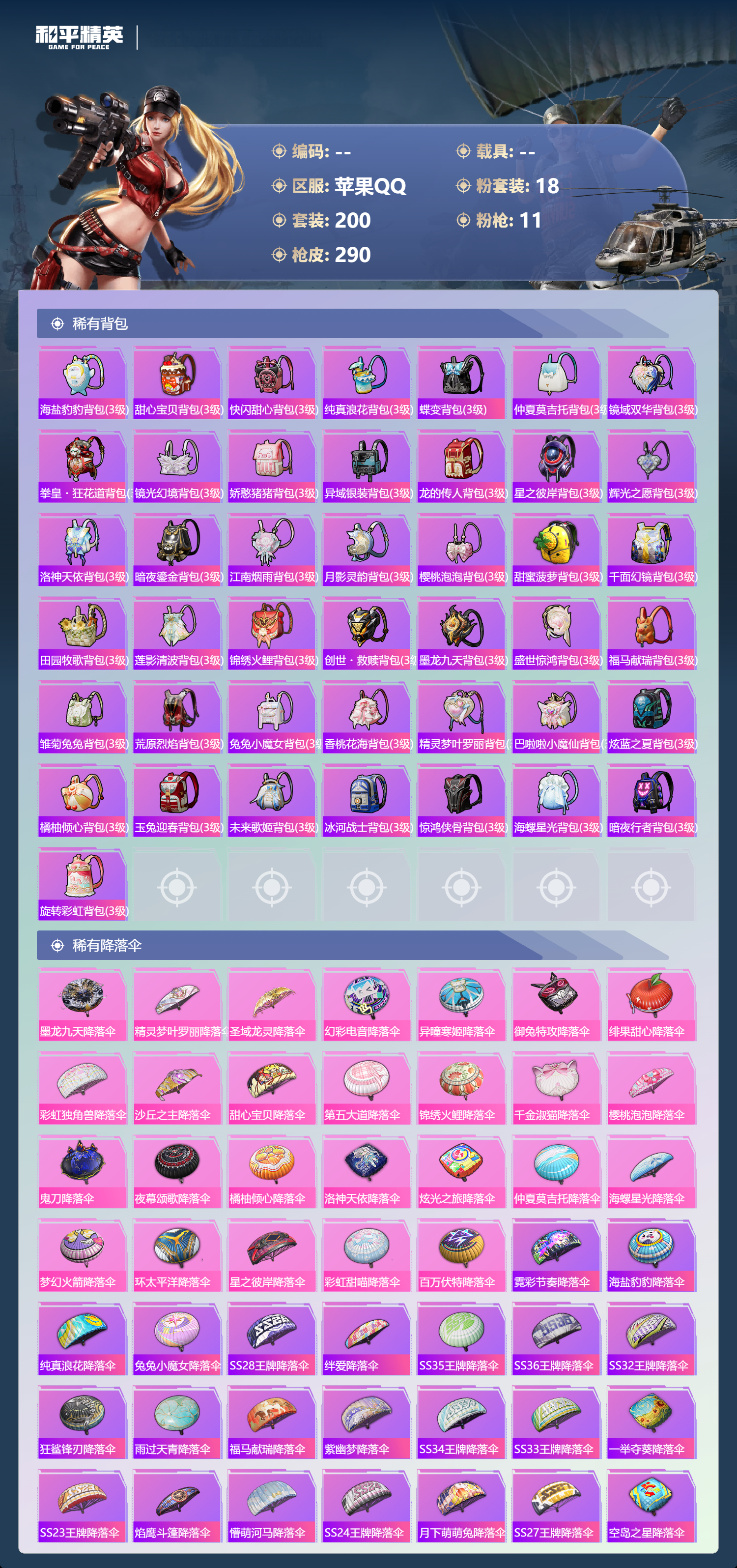 18王牌印记-1红装-18粉装-11特效枪-96311热力值-200套装-290枪皮-3卓越印记-2传奇印记