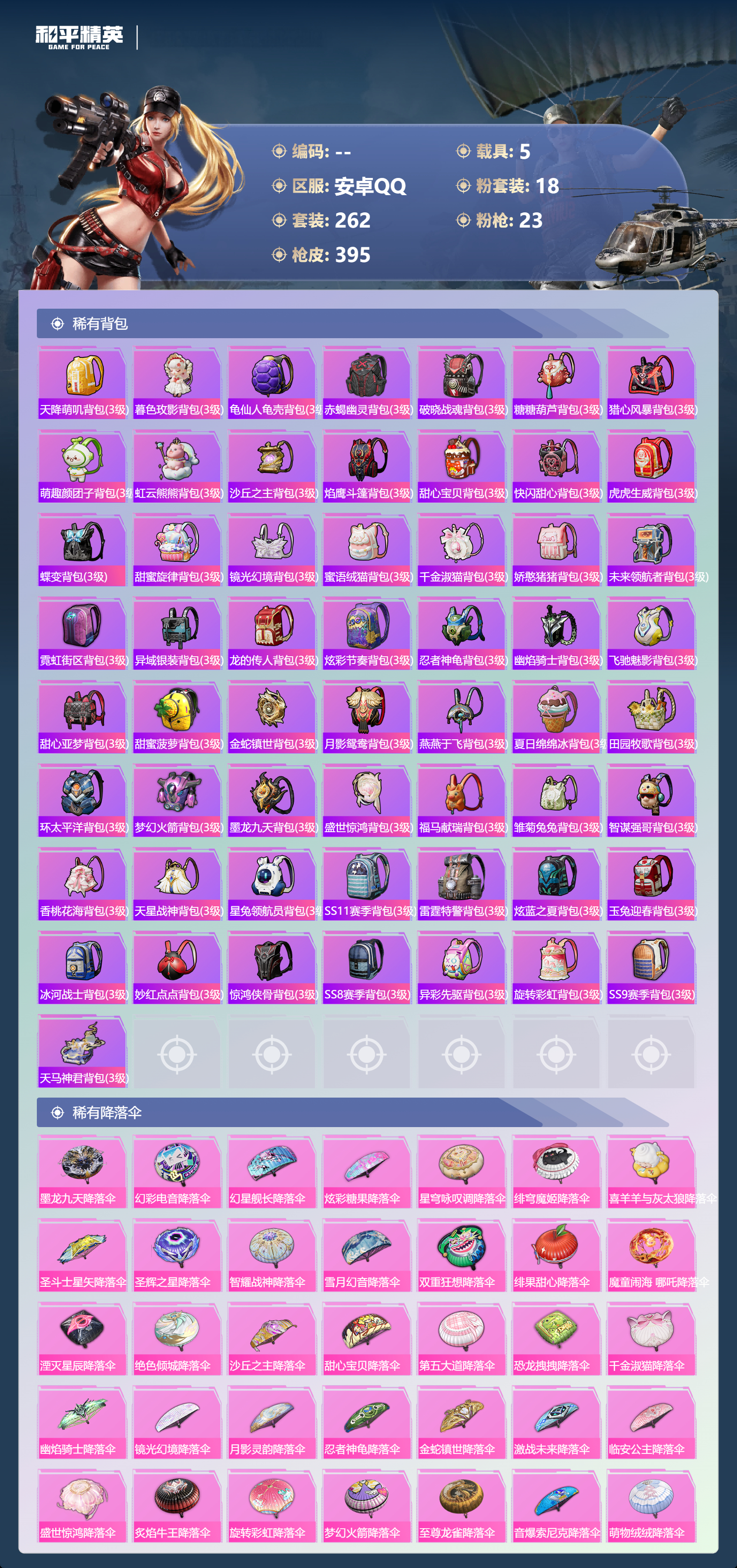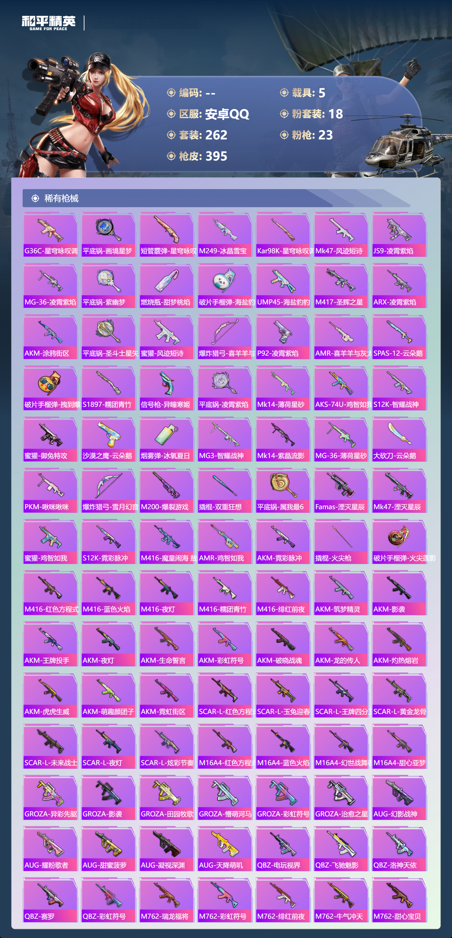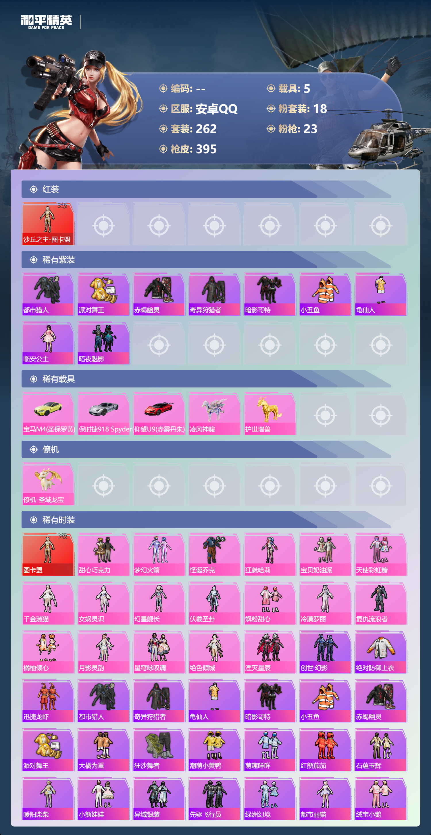 hs67324 安卓手Q-21王牌印记-有战神框-1红装-18粉装-23特效枪-5载具-热力值-262套装-395枪皮-6卓越印记-3传奇印记