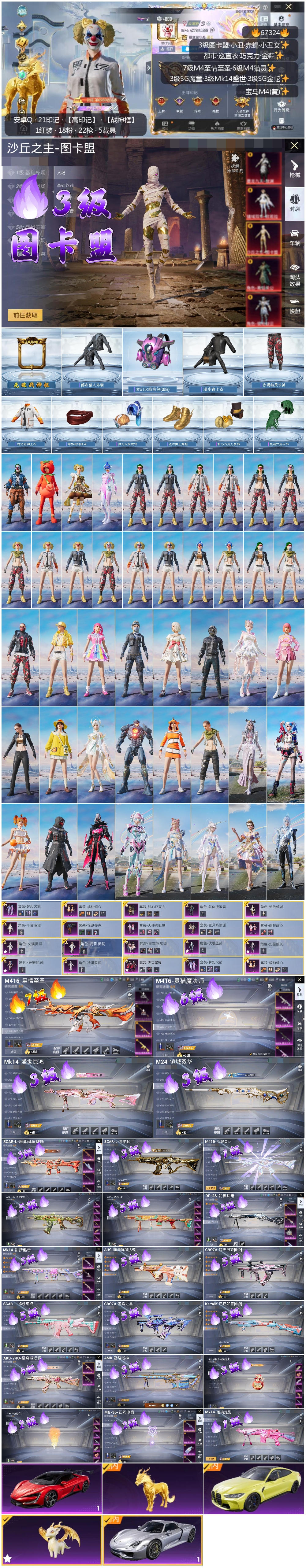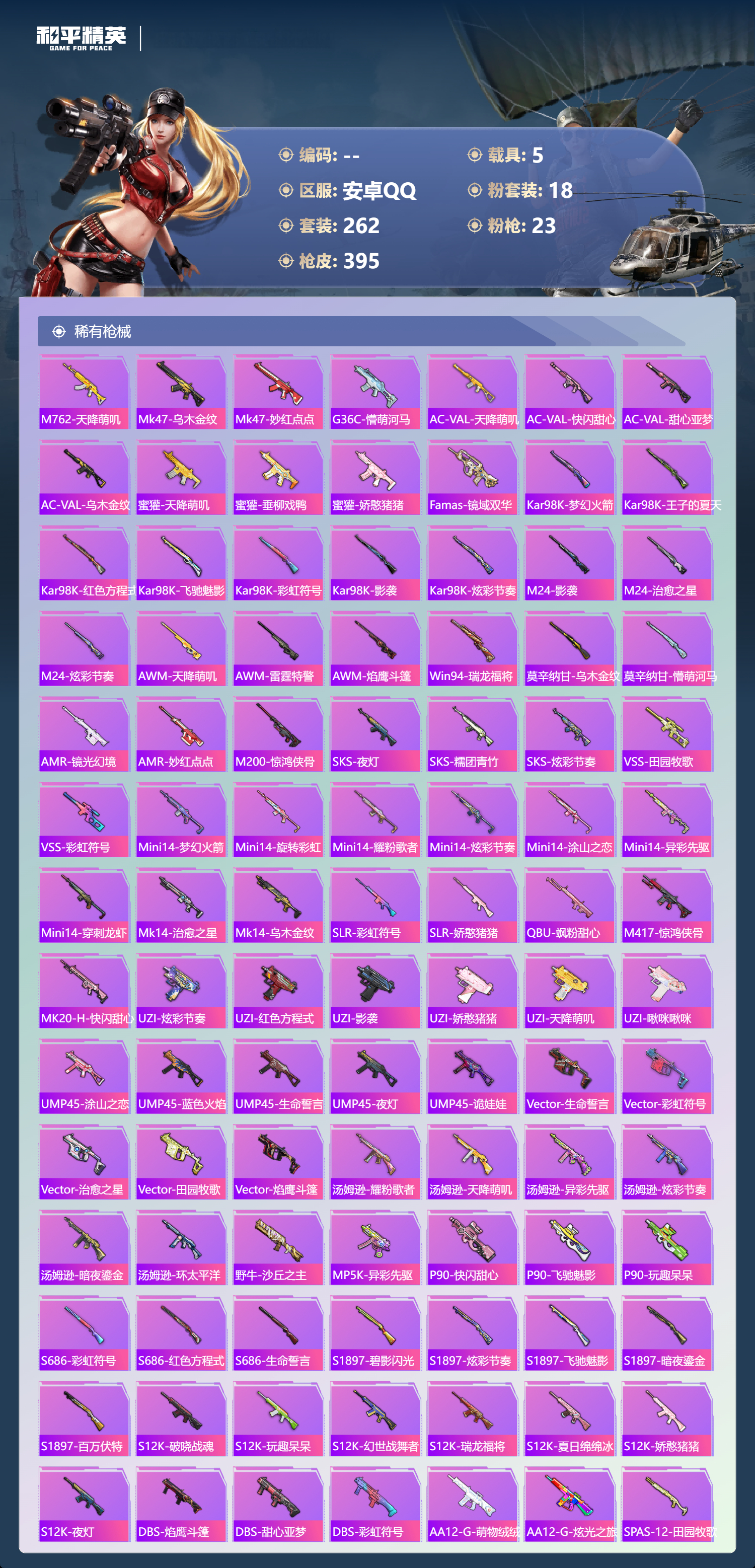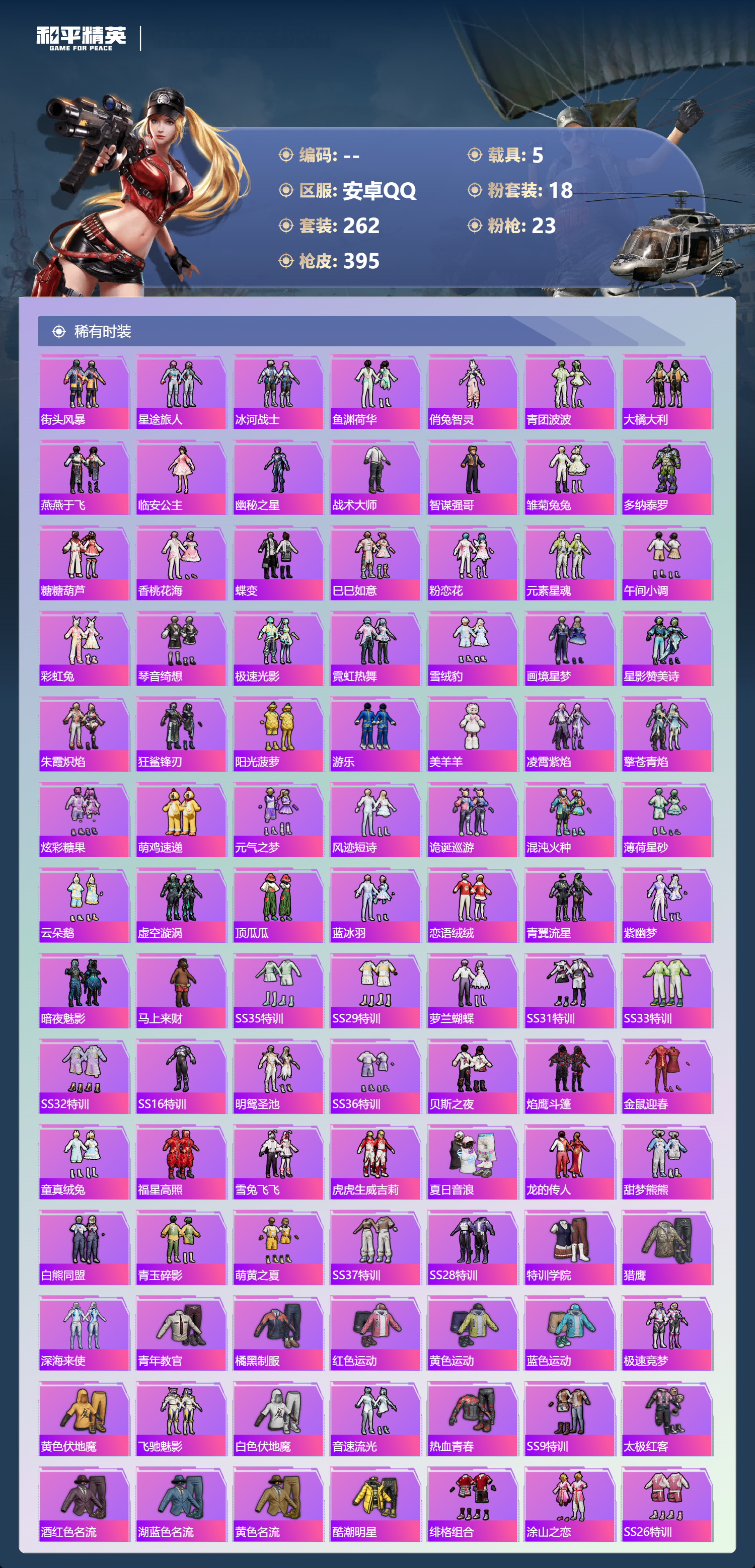 hs67324 安卓手Q-21王牌印记-有战神框-1红装-18粉装-23特效枪-5载具-热力值-262套装-395枪皮-6卓越印记-3传奇印记