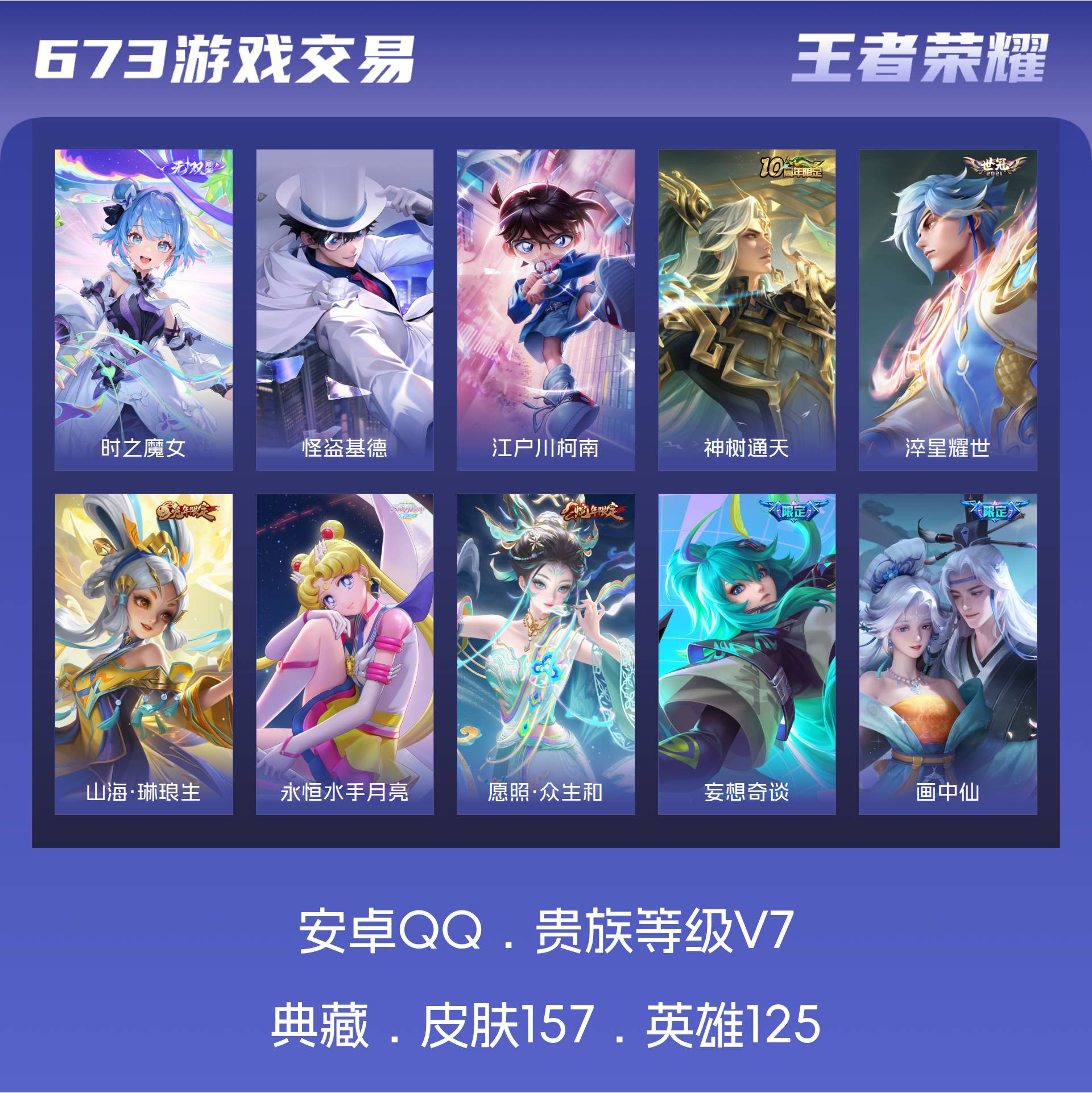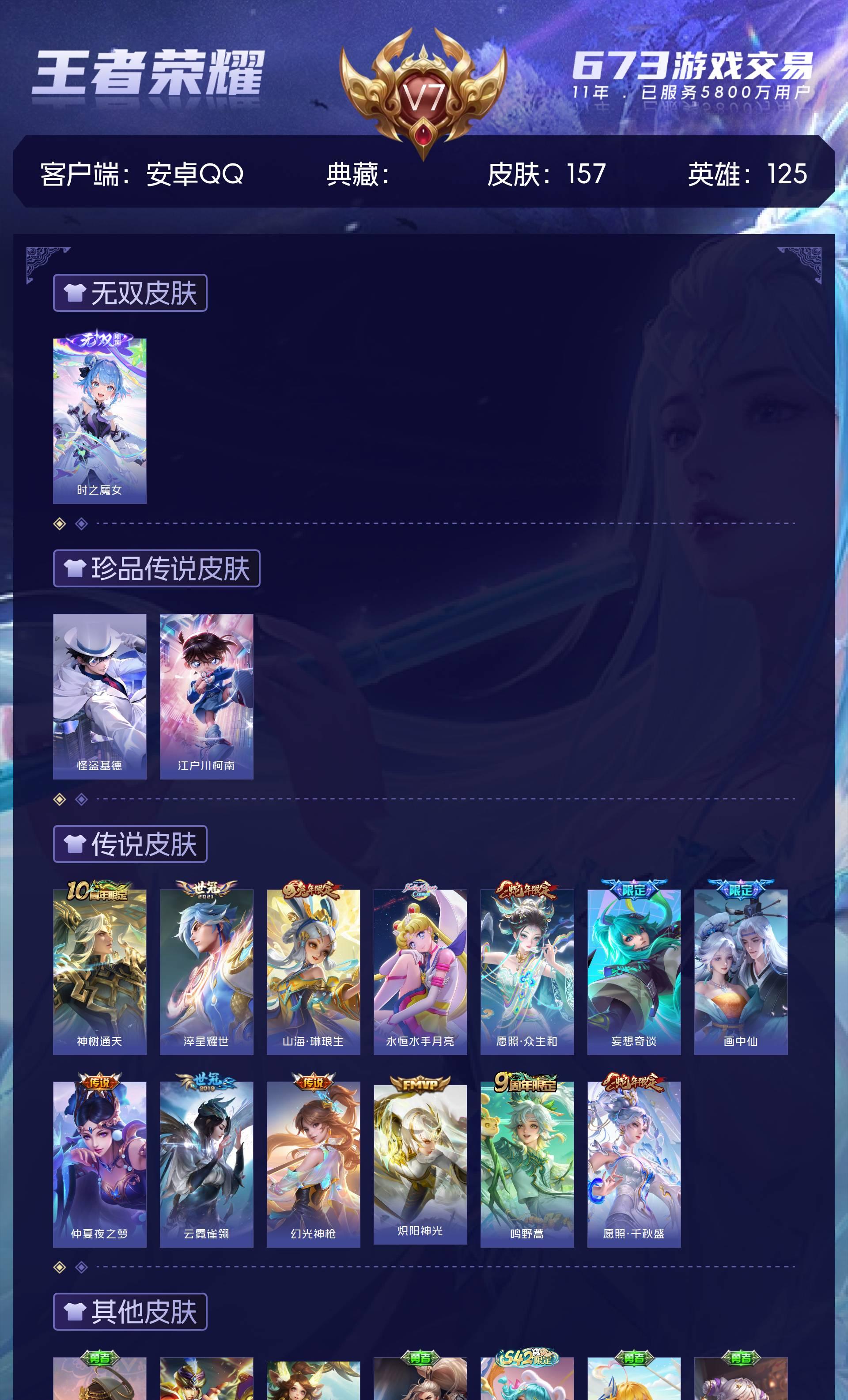 V7 皮肤157 英雄125 无双王者 无双皮肤1 珍品传说2 星传说1 传说13