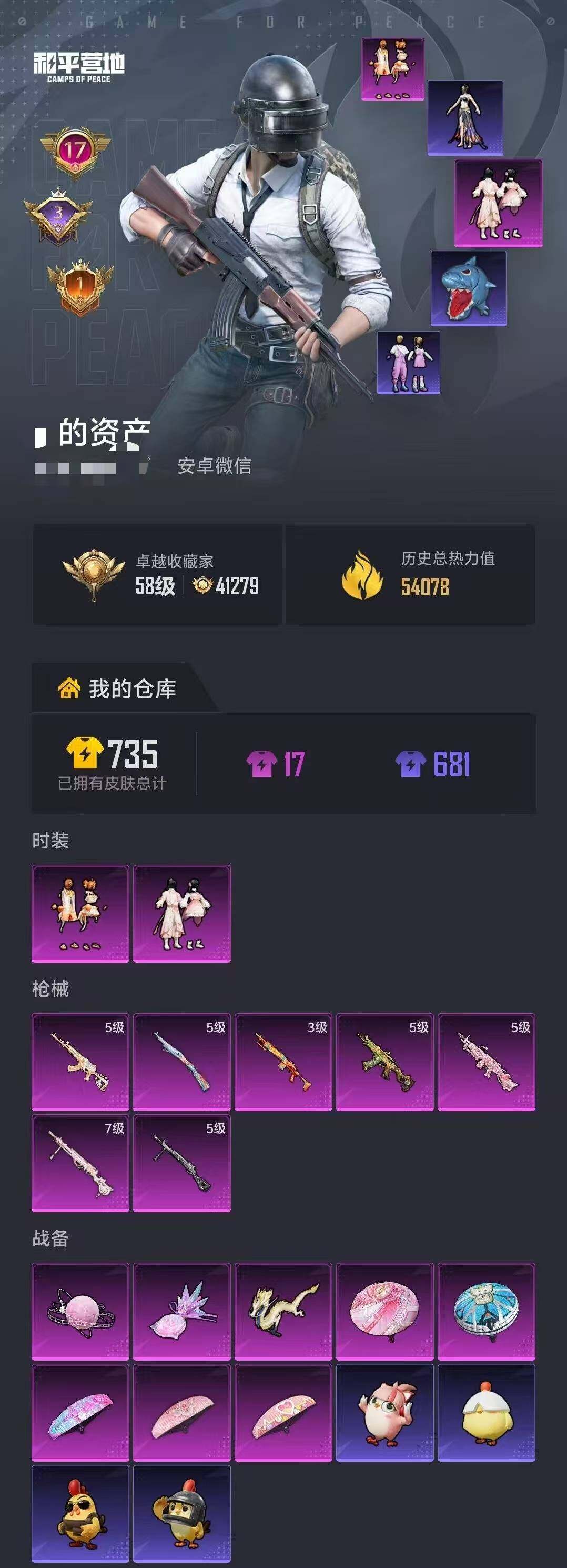 时装数: 672 枪械数: 193 战备数: 153 热门装扮: 迅捷狂鲨,橘柚倾心,桃粉嫣然 稀有枪皮: ACE32-萌骑漫游(五级),AKS-74U-森灵之息(五级),Kar98K-巳巳如意(五级),Mk14-福马献瑞(三级),M249-绝对恒星(五级),DP-28-千金淑猫(七级),DP-28-豹影疾电(五级)