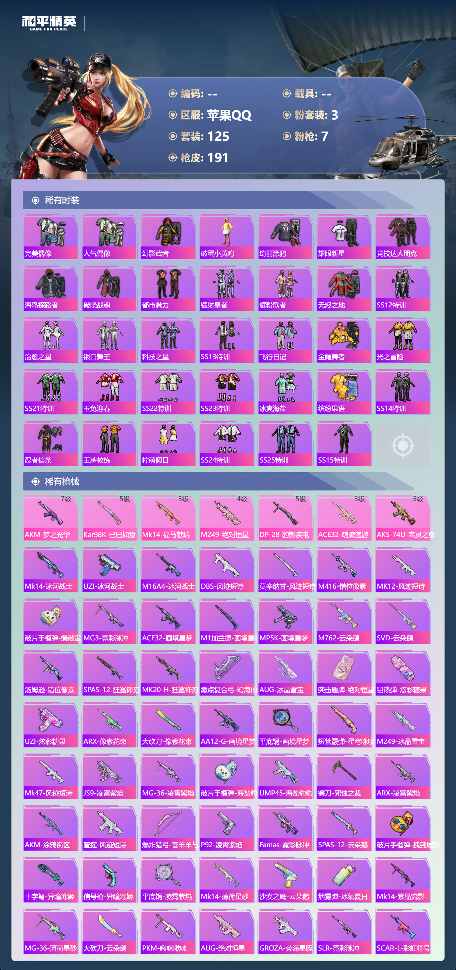hs67371 苹果手Q-7王牌印记-3粉装-7特效枪-48957热力值-125套装-191枪皮-1卓越印记