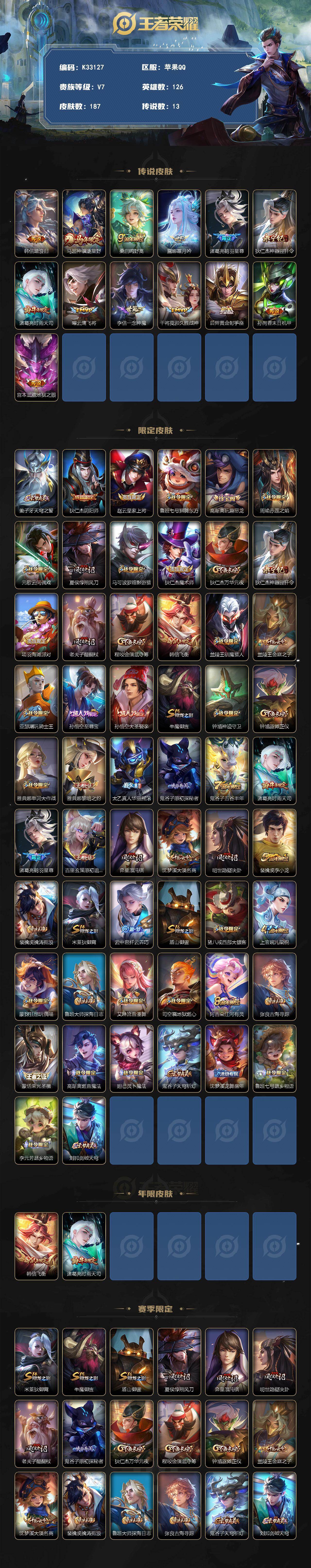 苹果Q-V7-最强王者段位-126英雄-187皮肤-13传说-58史诗