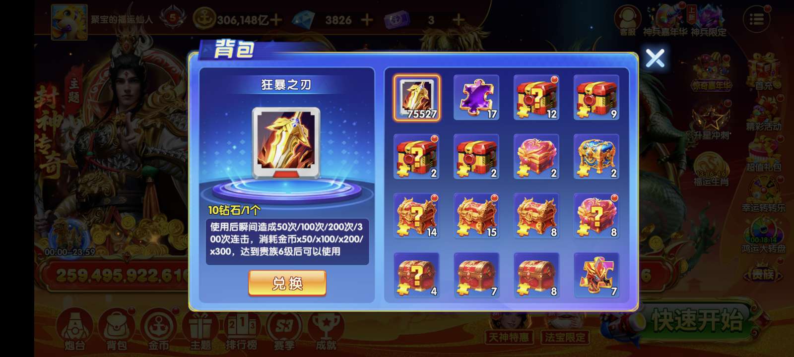 乐乐捕鱼30万亿解绑带号出v5(没开百倍威力)1.4亿炮限时3.5 有万象神兵多多材料多多