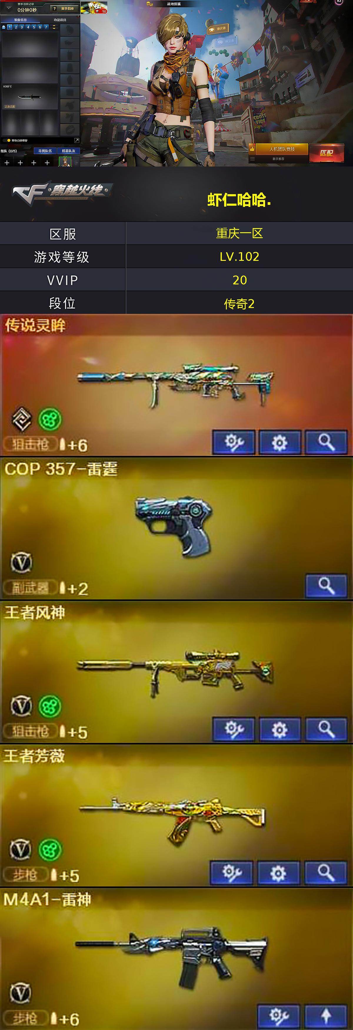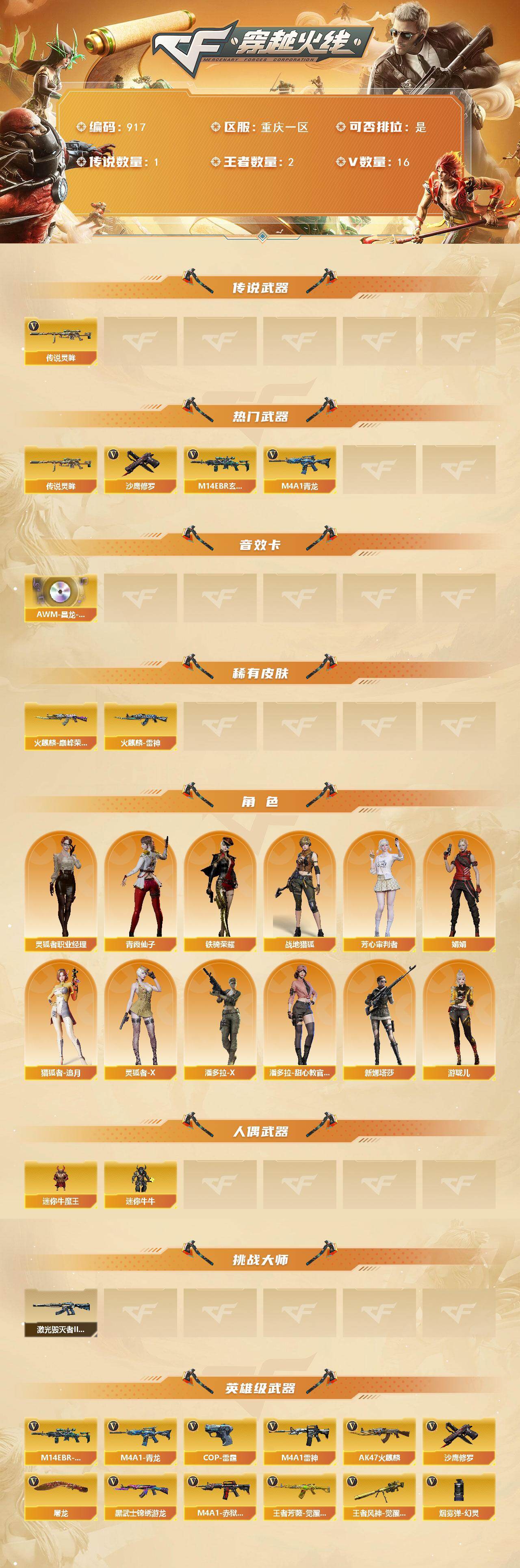 重庆一区-16V-2王者-0炫金【传说武器】:传说灵眸【热门武器】:传说灵眸,M14EBR-玄武,M4A1-青龙,沙鹰-修罗*6【音效卡】:AWM-昌龙-怀旧音效卡*2【皮肤】:火麒麟-雷神,火麒麟-巅峰荣耀【角色】:战地猎狐,芳心审判者,娟娟,猎狐者-追月,灵狐者-X,灵狐者-职业经理,潘多拉-X,潘多拉-甜心教官,青霞仙子,铁骑荣耀,新娜塔莎,游珑儿【人偶武器】:迷你牛魔王,迷你牛牛【挑战大师】:激光毁灭者III-白马银枪【英雄级武器】:AK47-火麒麟,M4A1-雷神,M4A1-青龙,M1