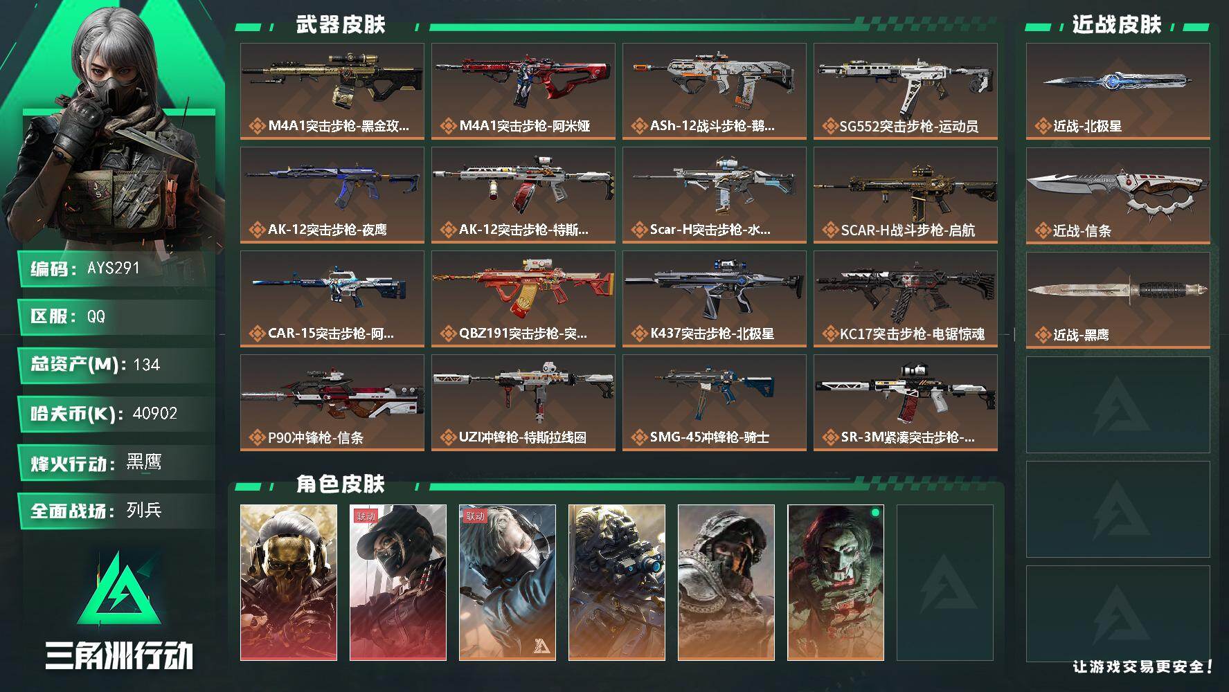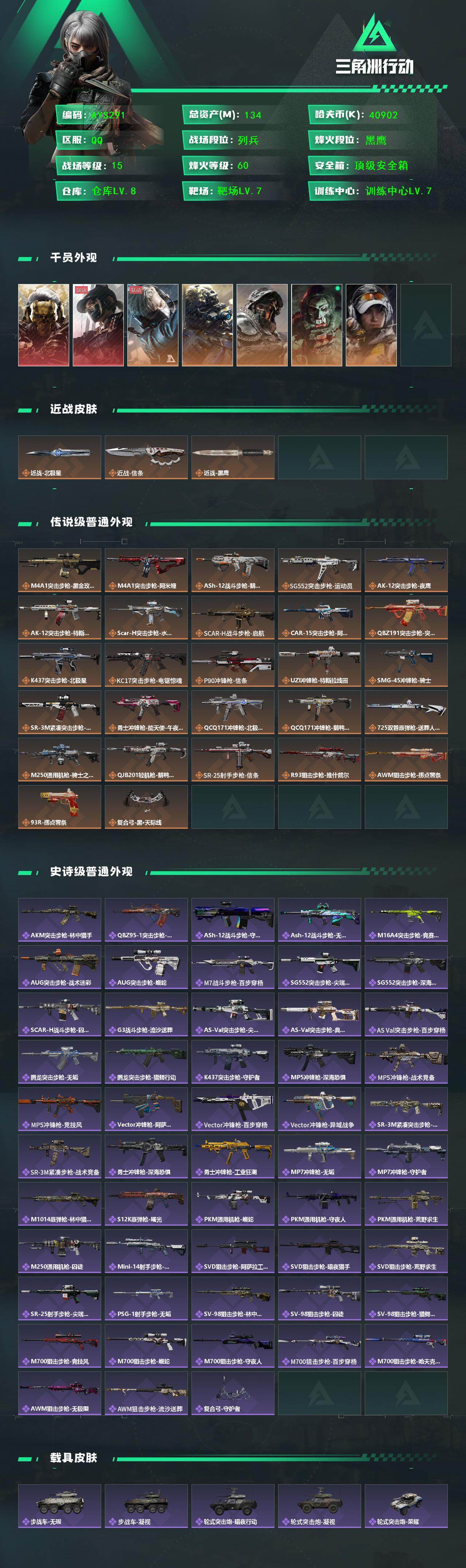 134m总资产-40902k哈伏币-60烽火等级-黑鹰-15战场等级-列兵【干员外观】:红狼-蚀金玫瑰,露娜-黑·天际线,蜂医-送葬人·无题密令,无名-夜鹰,深蓝-不破誓约,红狼-电锯惊魂,露娜-金牌射手【近战皮肤】:近战-北极星,近战-信条,近战-黑鹰【传说外观】:M4A1突击步枪-蚀金玫瑰,M4A1突击步枪-阿米娅,ASh-12战斗步枪-鹅鸭杀,SG552突击步枪-运动员,AK-12突击步枪-夜鹰,AK-12突击步枪-特斯拉线圈,SCAR-H战斗步枪-水墨云图,SCAR-H战斗步枪-启航,C