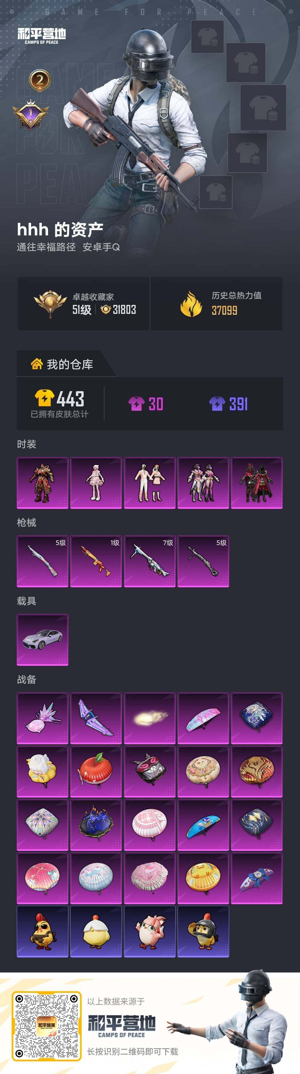 【特价出售/店主推荐】安卓 手Q-5粉装-4特效枪-1载具-3粉色飞行器-37099热力值-2王牌印记-74套装-116枪皮【热门品类】:套装-粉红小猪【粉色套装】:粉装-炙焰红王,粉装-银红美神,粉装-第五大道,角色-羊梦糖心,角色-虎痴许褚【粉色枪皮等级】:Kar98K-巳巳如意(五级),Mk14-福马献瑞(一级),DP-28-豹影疾电(五级),MG3-洛神天依(七级)【粉色载具】:保时捷P