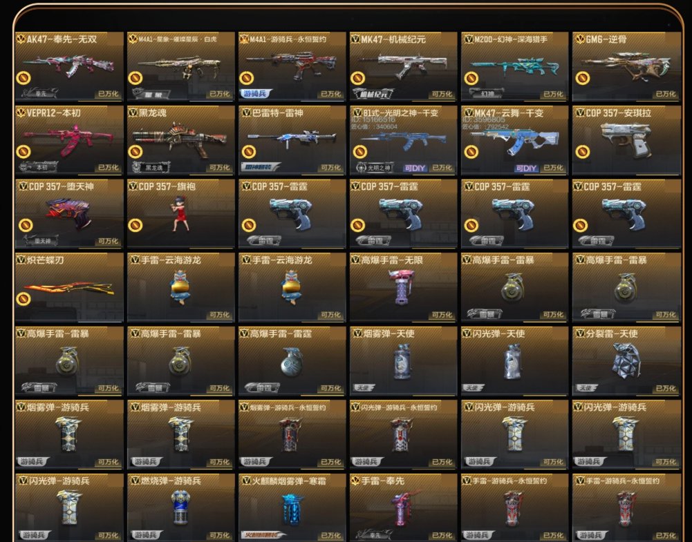 【安卓QQ】 角色等级:元首 【角色】关小雨、零-水下丽影、零、夏日灵狐-X、刀锋-枪战王者 【武器】王者之影、王者之心、王者之狱、QBZ03-王者蔷薇、王者之魂、王者之锋、AK47-奉先、M4A1-星象、M200-权、VEPR12-本初、M200-幻神、TAC-雷暴、AWM-游骑兵、AWM-天龙、巴雷特-雷神、巴雷特-雷霆、巴雷特-极光、98K-星神、98K-黑骑士、M4A1-太白诗仙、M4A1-游骑兵、M4A1-竞界荣光、AK47-雷暴、AK47-雷霆、MK47-机械纪元、汤姆逊-烈龙、M1