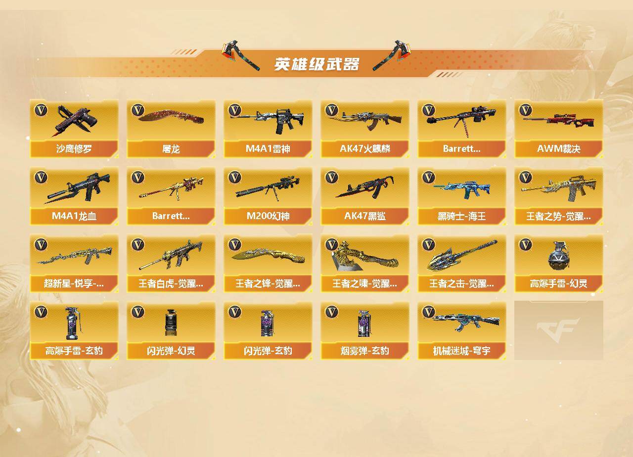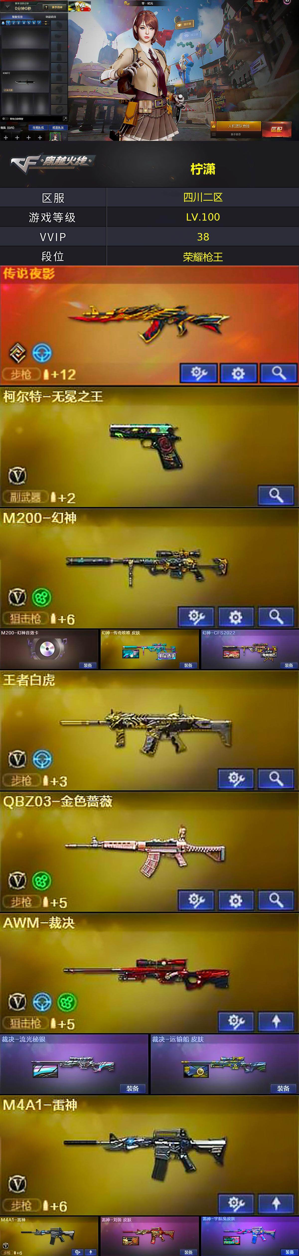 四川二区-46V-10王者武器数-1炫金武器数【传说武器】:传说夜影【热门武器】:传说夜影,QBZ03-金色蔷薇,HK417-朱雀,M200-幻神,雷神-小红,沙鹰-修罗【王者炫金武器】:高爆手雷-雷霆王者*2,炫金千变【音效卡】:M200-幻神音效卡,Barrett-碧霄极光音效卡*2【皮肤】:幻神-CFS2022,幻神-传奇欧欧 皮肤,裁决-流光秘银,裁决-运输船 皮肤,雷神-宇航兔皮肤,雷神-刘备 皮肤,毁灭-星空,毁灭-百城浙江 皮肤,毁灭-虹光风暴 皮肤,毁灭-英雄计划 皮肤,天启-暗