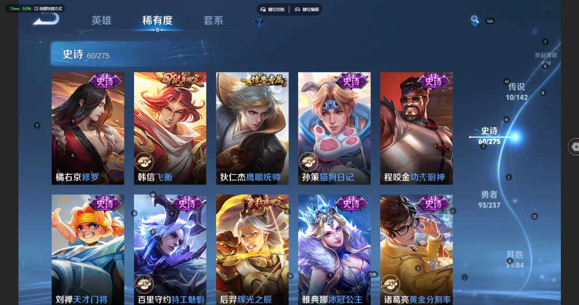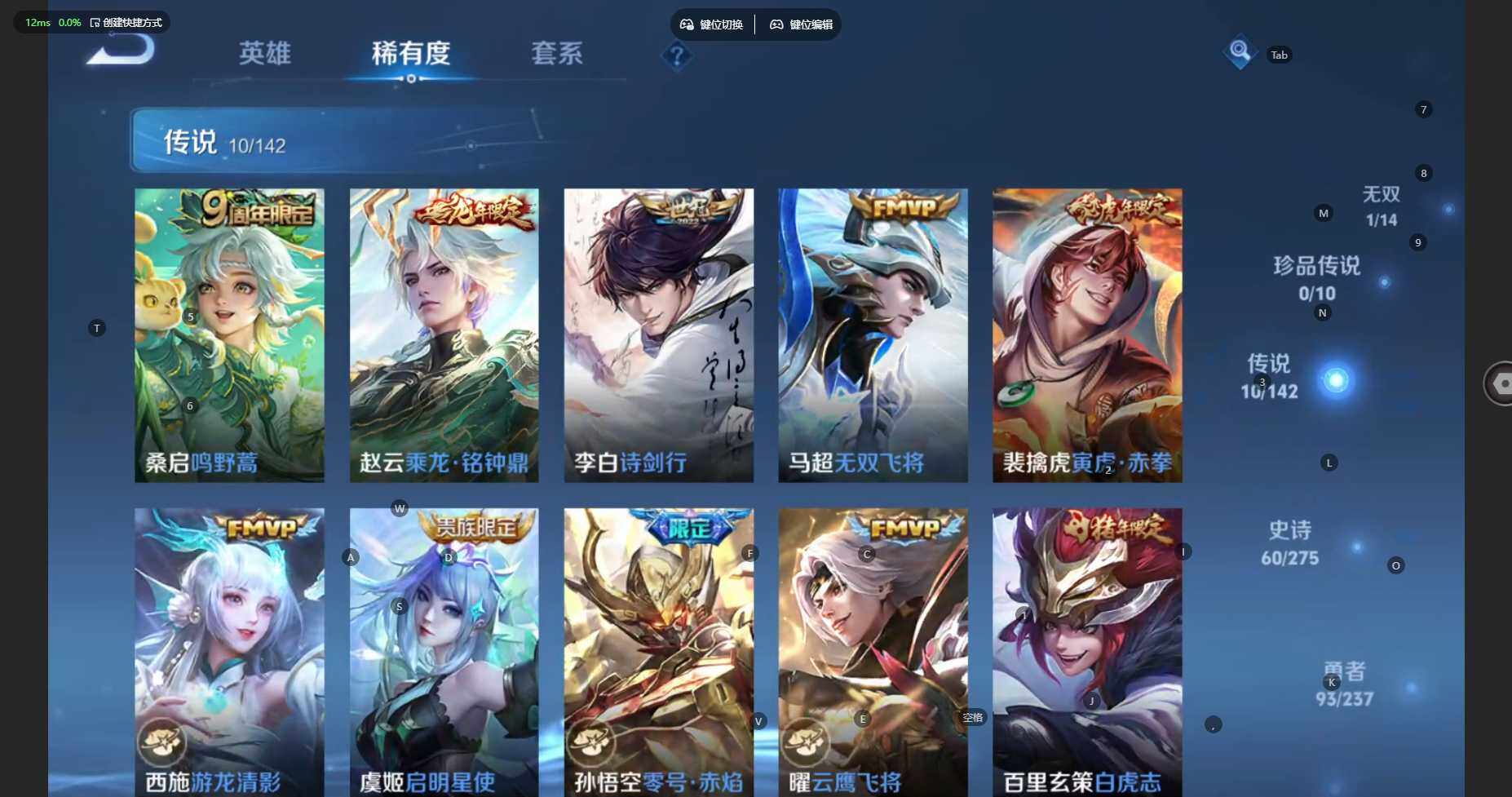 苹果WX-V8-最强王者段位-113英雄-196皮肤-1典藏皮肤-1无双-10传说-59史诗