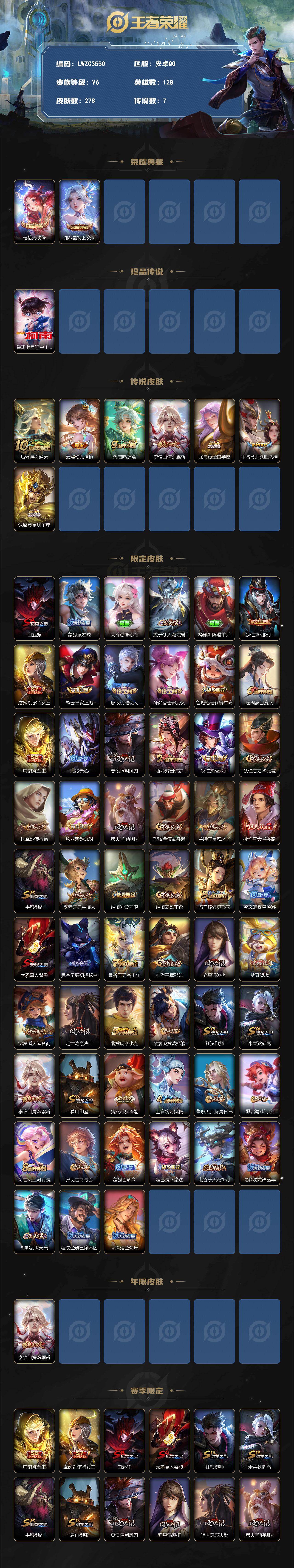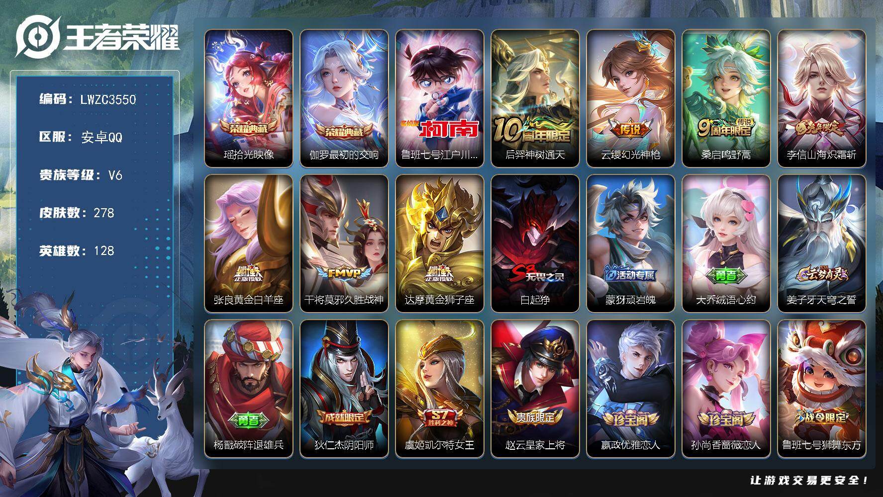 可二次【特价出售/店主推荐】安卓Q-V6-最强王者段位-128英雄-278皮肤-2典藏皮肤-1珍品传说-7传说-76史诗【荣耀典藏】:瑶拾光映像,伽罗最初的交响【珍品传说】:鲁班七号江户川柯南【传说皮肤】:后羿神树通天,云缨幻光神枪,桑启鸣野蒿,李信山海炽霜斩,张良黄金白羊座,干将莫邪久胜战神,达摩黄金狮子座【限定皮肤】:白起狰,蒙犽顽岩魄,大乔绒语心约,姜子牙天穹之誓,杨戬破阵退雄兵,狄仁杰阴阳师,虞姬凯尔特女王,赵云皇家上将,嬴政优雅恋人,孙尚香蔷薇恋人,鲁班七号狮舞东方,庄周高山流水,扁鹊