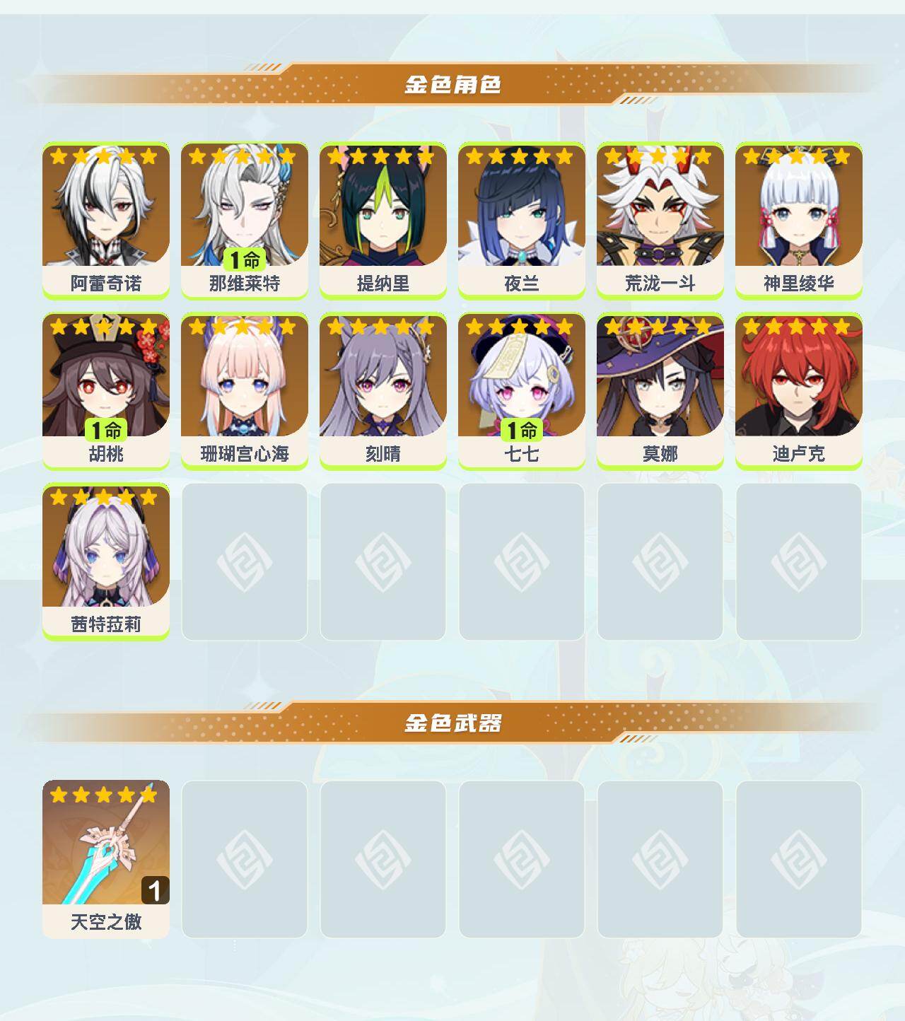 【YS1411】56级/17黄/女主/13个五星角色/1个五星武器/1命胡桃/夜兰/茜特菈莉/迪卢克/神里绫华/阿蕾奇诺/珊瑚宫心海/荒泷一斗/1命那维莱特/刻晴/1命七七/提纳里/莫娜/天空之傲