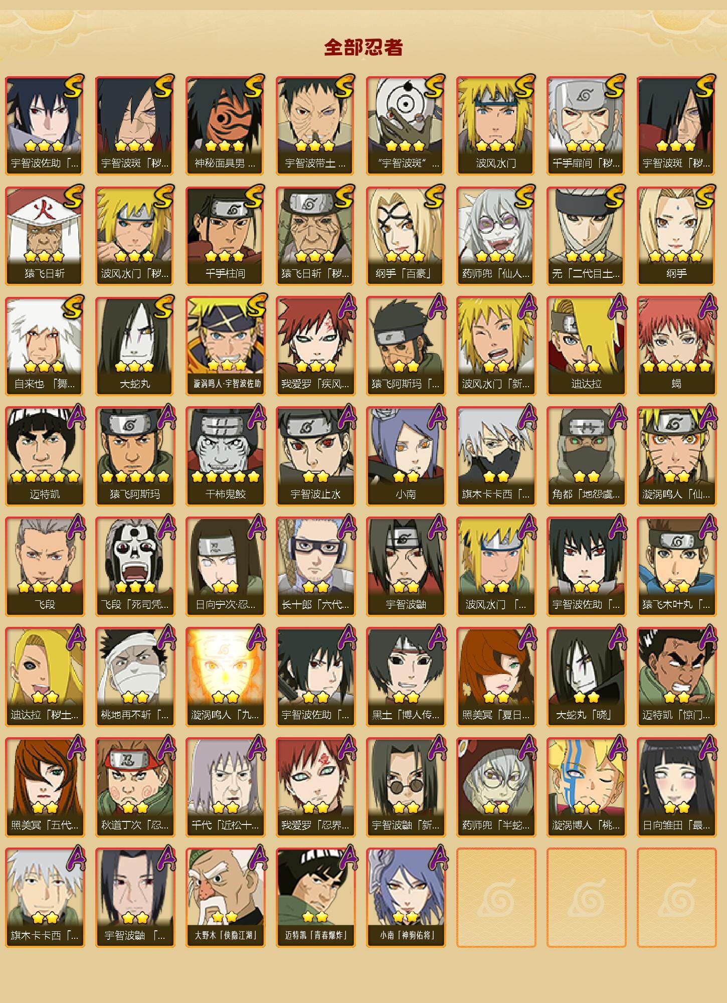 【S级忍者】:猿飞日斩「秽土转生」(3星),波风水门「秽土转生」(3星),千手扉间「秽土转生」(3星),宇智波斑「秽土转生」(3星),宇智波斑「秽土转生·解」(3星),宇智波带土「忍界大战」(3星),无「二代目土影」(3星),自来也「舞之豪杰」(3星),大蛇丸(3星),纲手(4星),纲手「百豪」(3星),千手柱间(3星),猿飞日斩(3星),波风水门(3星),药师兜「仙人模式」(3星),神秘面具男「红夜之刃」(3星),宇智波佐助「永恒万花筒」(3星),宇智波斑 「白